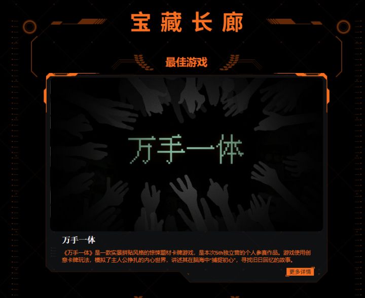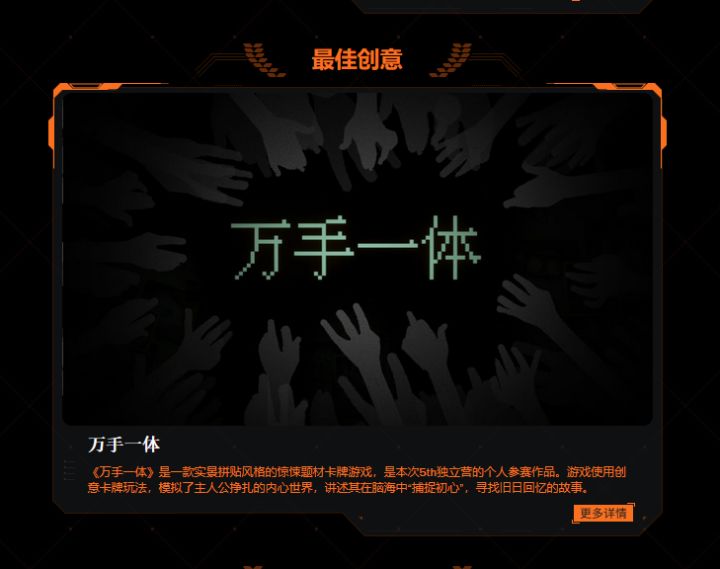 芜湖!各位关注《万手一体》的大手子们!宣布一个喜讯!那就是我们的《万手一体》在昨天获得了2022GWB独立游戏大奖「最佳视觉风格」!感谢各位大手子们对我们游戏的一直关注和支持,才能让我们有动力一直的做下去!我们也才能坚持到现在,获得了这个奖项!感谢各位大手子们的支持!为了答谢大家的支持!我们游戏接下来会有大动作喔!要想了解一手的信息,欢迎加官方群:966519332P.S. 所有的一