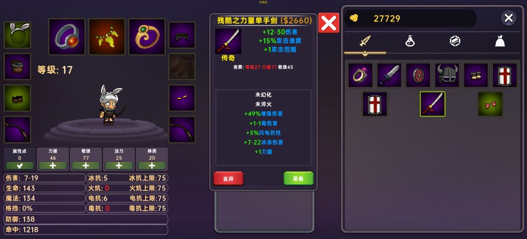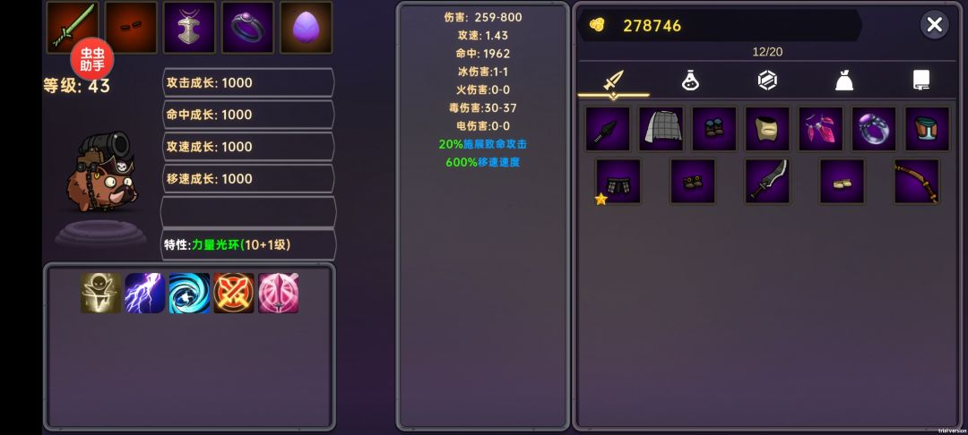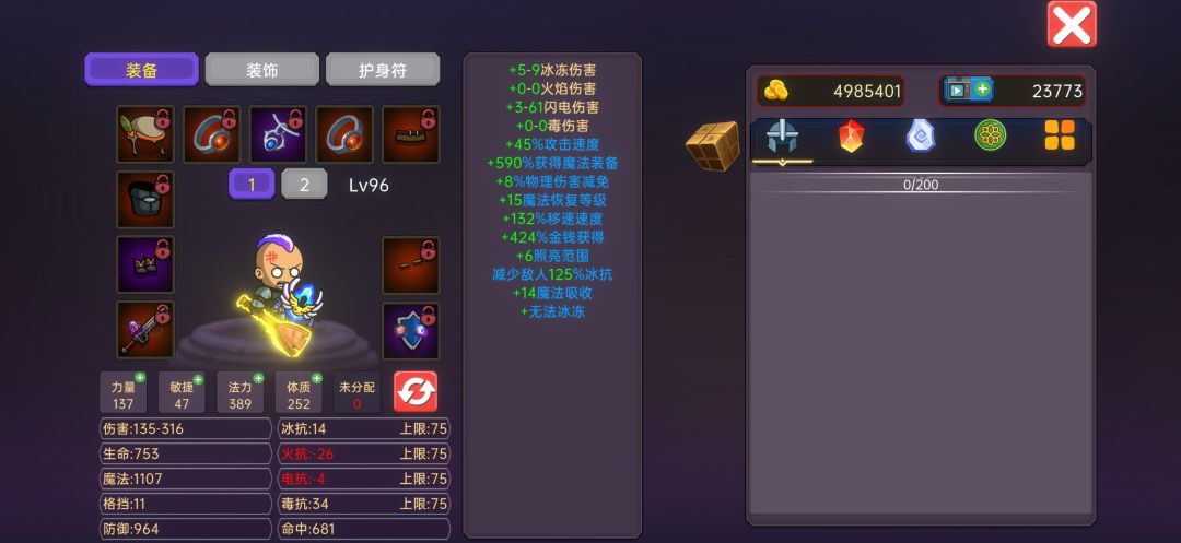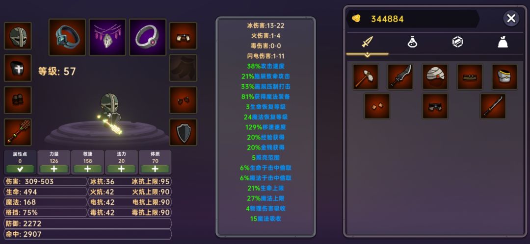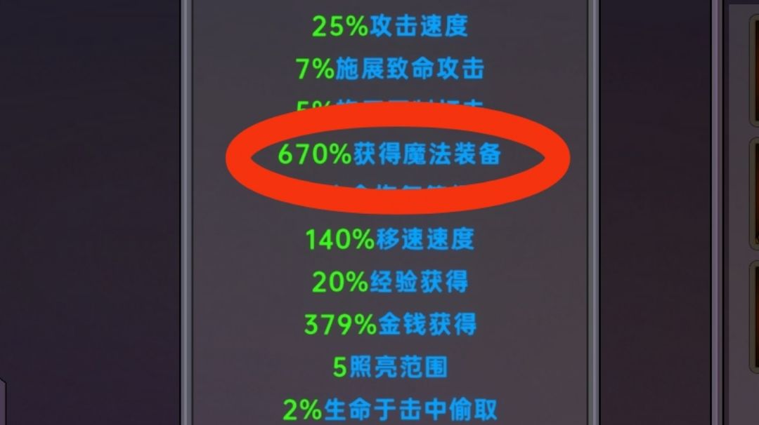 为了一秒三刀解决所有怪,首先离不开一个关键属性:压制打击,每次攻击直接按当前血量百分比扣血。再者想要一秒三刀还需要提高攻速,攻速快了压制打击触发得就快。最后保证一定的伤害以及一点点攻击回蓝回血。