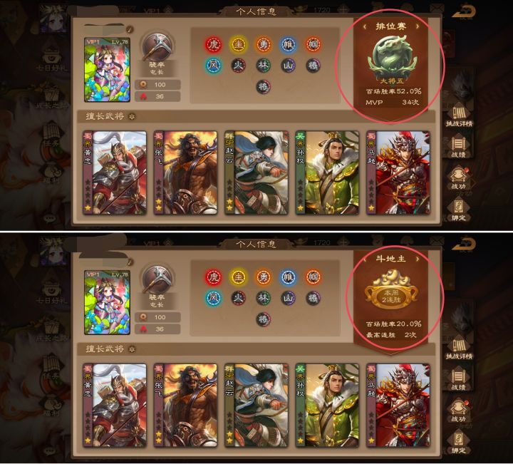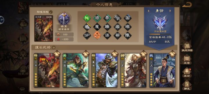 玩了几天感觉到了瓶颈期了,来写一下评价吧,排位的段位是大将五,赢一把输一把的,估计是卡在这个段位了,百场胜率52%,我觉得并不是我打的有多菜,三国杀这游戏大家都知道,有时候即使你每一步都走对了,每一步都是最佳牌序,该输还是得输。