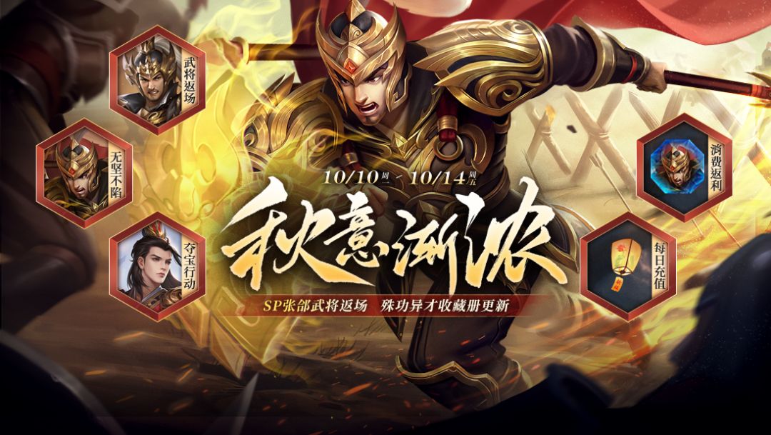 新品武将 武将福利 活动时间:2023-10-21 00:00:00~2023-10-27 23:59:59,完成相应任务,即可获得奖励,累计限完成1次。 新品皮肤 活动时间:2023-10-21 00:00:00~2023-10-27 23:59:59 热力活动 活动时间:2023-10-21 00:00:00~2023-10-27 23:59:59 1、活动期间,每消费100元宝,可获得热力积