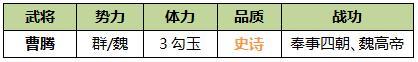原创作者:爱多i 原帖链接:https://club.sanguosha.com/thread-1365331-1-1.html 微信搜索‘’三国桃园‘’小程序,更多精彩内容等你来看~ 一、武将介绍 (一)人物生平 曹腾,字季兴,东汉时期宦官。曹腾早年因事入宫,担任黄门从官、太子侍读。汉顺帝即位后,历任小黄门、中常侍、长乐太仆。他因策划迎立桓帝有功,受封为“费亭侯”,并累迁至大长秋,加位特进。曹腾