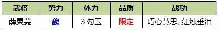 原创作者:爱多i 原帖链接:https://club.sanguosha.com/thread-1632147-1-1.html 微信搜索‘’三国桃园‘’小程序,更多精彩内容等你来看~ 一、武将介绍 (一)人物生平 曹丕宫人,不见于正史。《拾遗记》记载其姓名为“薛灵芸”,被曹丕改名为“薛夜来”。薛灵芸离开父母时,路中落泪于壶中,等到京城后泪凝如血。薛灵芸擅长针工,宫中称其为“针神”。 (二)武将简