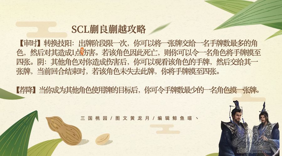 原创作者:鲱鱼喵丶 原帖链接:https://club.sanguosha.com/thread-1237460-1-1.html 微信搜索‘’三国桃园‘’小程序,更多精彩内容等你来看~ 【二蒯攻略】感曹公之遇,荐诚心之降 二区不识黄龙月,纵使枭雄也枉然!疯狂暗示顶帖! 【审时】转换技阳:出牌阶段限一次,你可以将一张牌交给一名手牌数最多的角色,然后对其造成1点伤害。若该角色因此死亡,则你可以令一名
