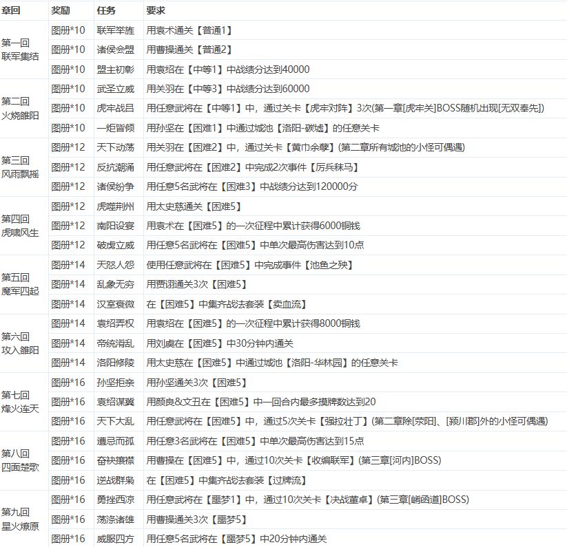 原创作者:孤独尊 原帖链接:https://club.sanguosha.com/thread-1446284-1-1.html 微信搜索‘’三国桃园‘’小程序,更多精彩内容等你来看~ 本次诸侯伐董山河图首次增加了章回任务,共总 9 * 3 = 27 个任务 其中不乏使用特定武将通关特定关卡多少次的要求,但奖励却是蚊子腿 为了有的玩家非要做这些任务,本贴整理了所有的任务要求和奖励,方便大家查阅 同