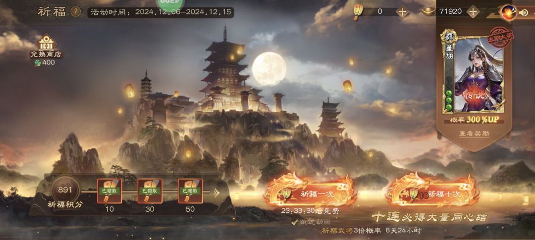 原创作者:鲱鱼喵丶 原帖链接:https://club.sanguosha.com/thread-1535420-1-1.html 微信搜索‘’三国桃园‘’小程序,更多精彩内容等你来看~ 2024年祈福商城经历了两次大幅度的降价,第一次是推出六折灯,第二次是大活动周的每日三折灯。部分祈福商城的武将目前仍是这个游戏的头部武将,价位下调,非常适合活跃玩家选取心仪的强将入手。本篇系统梳理当前祈福活动规