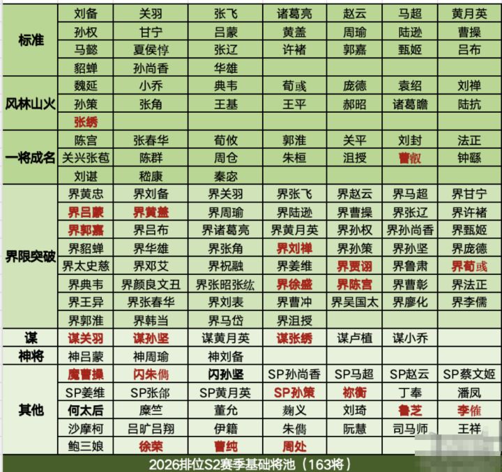 原创作者:鲱鱼喵丶原帖链接:https://club.sanguosha.com/thread-1895637-1-1.html微信搜索‘’三国桃园‘’小程序,更多精彩内容等你来看~ 基础将池(大将段位以下)一共163个武将:多为标风基础武将,对比全将池,数值和机制将都不多,这个版中版的大核是界荀彧,常用重点武将如下。常规辅助武将:曹叡,鲁芝,界陈宫一号先手将:李傕,界李儒,界贾诩,界黄