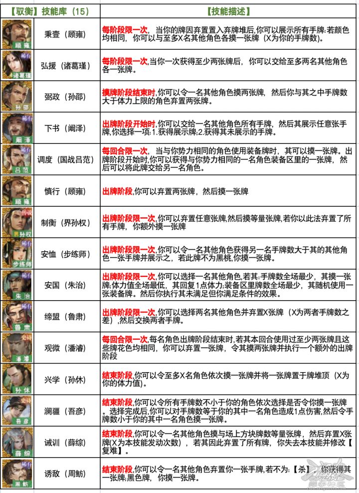 原创作者:鲱鱼喵丶原帖链接:https://club.sanguosha.com/thread-1253063-1-6.html微信搜索‘’三国桃园‘’小程序,更多精彩内容等你来看~1. 先说驭衡技能库 驭衡的技能库一共有15个,可以笼统的归为两大类:结束阶段的过牌技能,【诱敌】【澜江】【兴学】,主要作用是觉醒前过牌找花色,辅助快速觉醒;觉醒后进入正向优势循环的神孙权其实并不缺牌,锦上添花