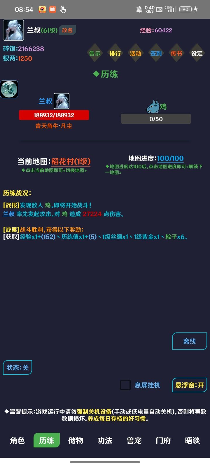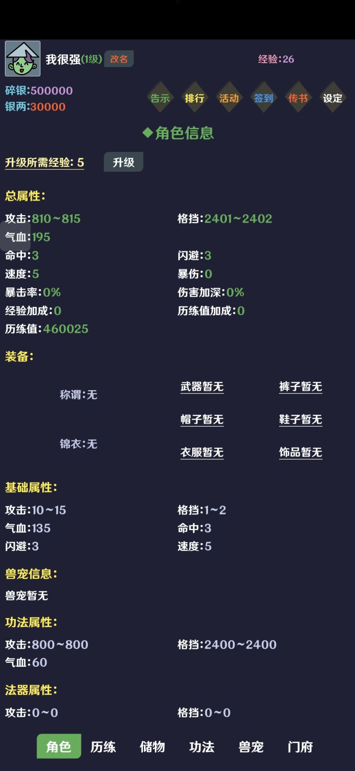 这个游戏每个月1号10点开新区卡着时间进去(一步领先步步领先,方便冲击排行榜)首先进入游戏,点击稻花村,开始打怪,右上角传书,领取开区礼包,会有一些功法,全学了。点击右下角门府取名,然后坊市\功法再买一本3星的火和土下限,回历练页面\功法把火土升满,并激活,马上就能得到一个属性非常均衡的初始角色。这个游戏不缺血量,只要升级攻击和防御就可以。历练右上地图100就激活并且更换新地图一边打怪一边加群