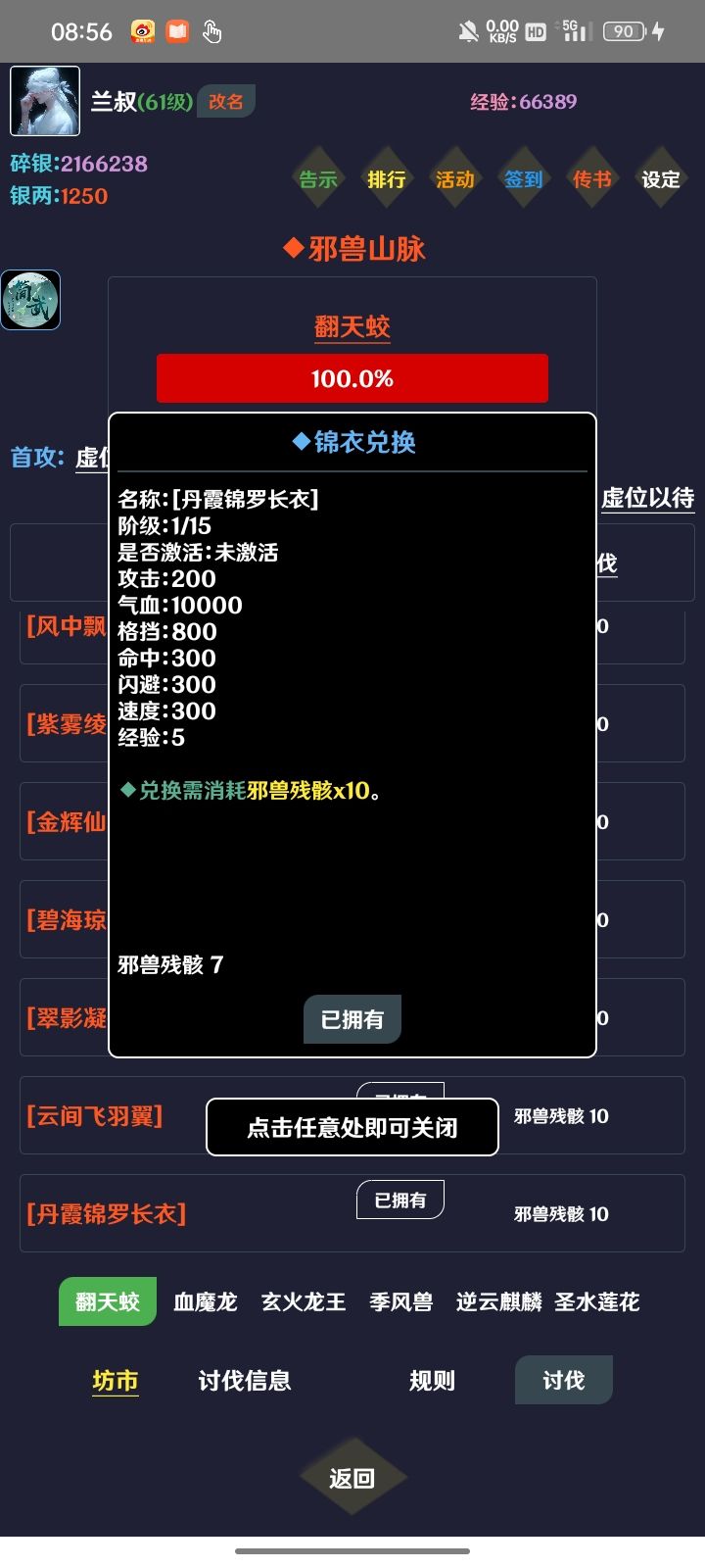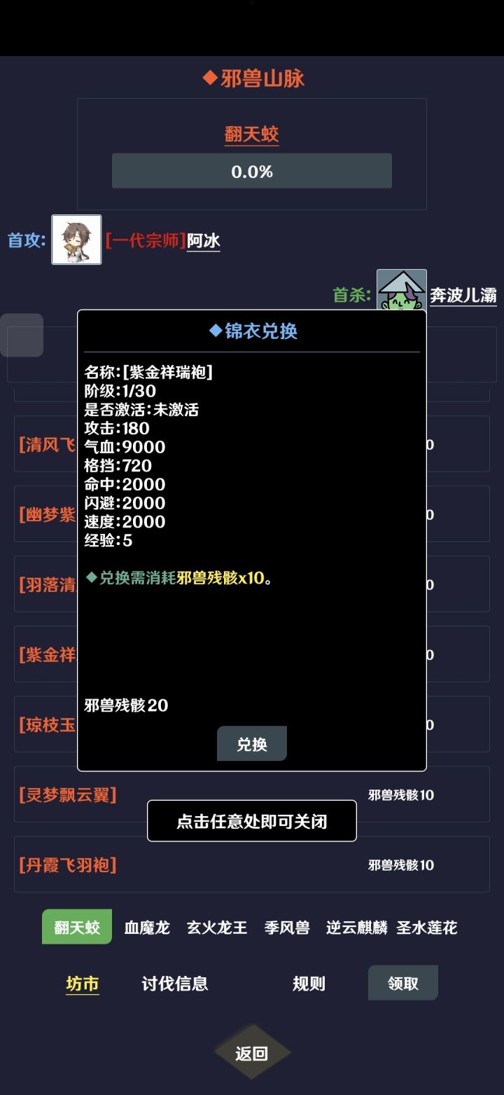1、进入游戏后先把告示里的兑换码都换了;然后加入QQ群把群公告的兑换码换了,送的20个邪兽残骸去邪兽山脉坊市里购买2个+2经验的锦衣(锦衣有+1经验和+2经验的,注意辨别) 告示里送的3星火功法可以酌情升到10级或20级。2、锦衣有属性加成,换完之后可以一刀秒第一张图的鸡,刷1.6万只鸡,拿完所有杀鸡成就。1.6万怪在线也需要将近13个小时,离线将近18小时。3、银两除了活动兑换码赠送的外,游