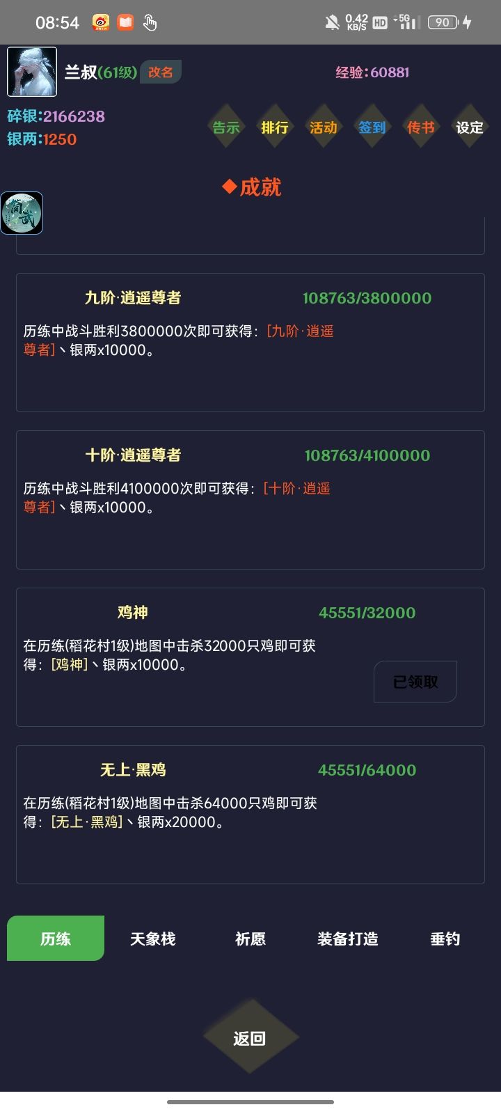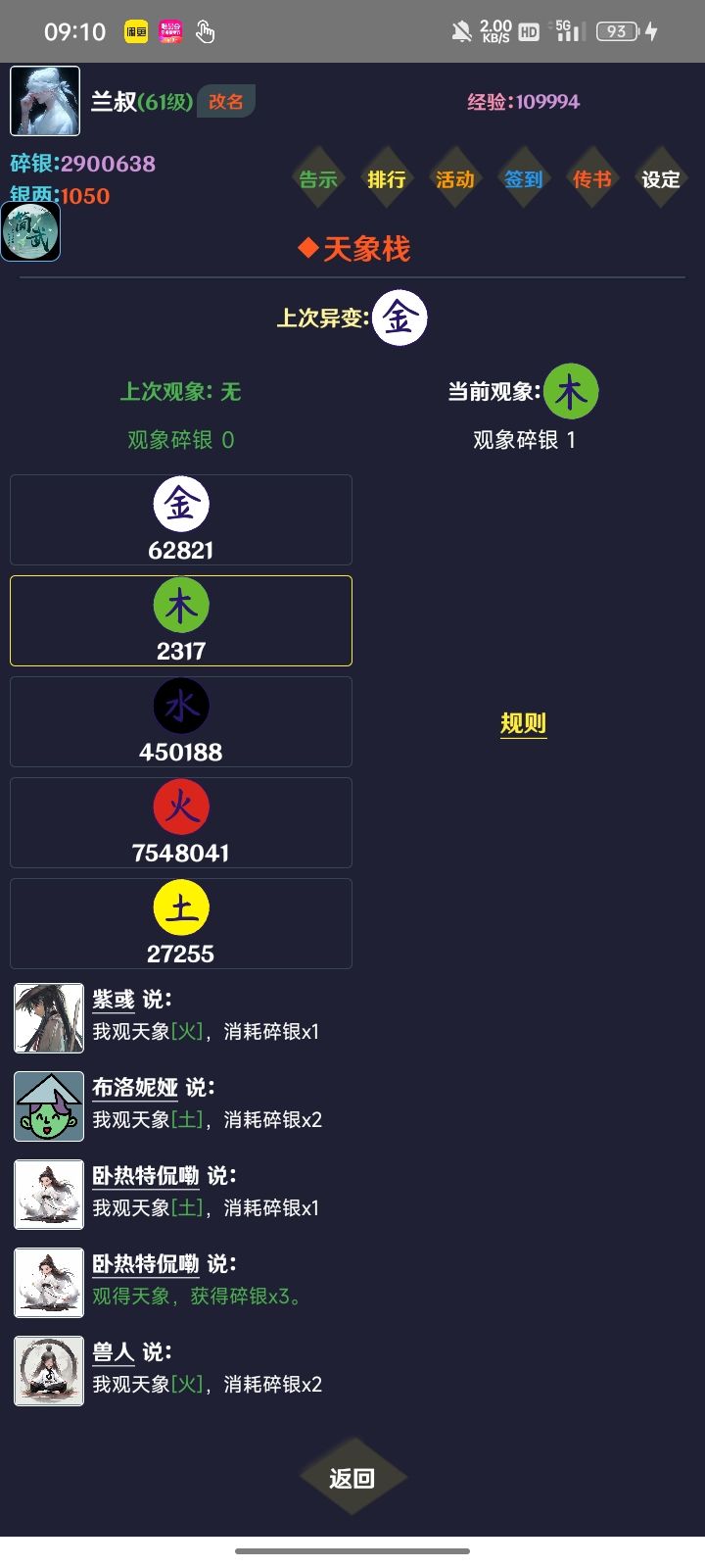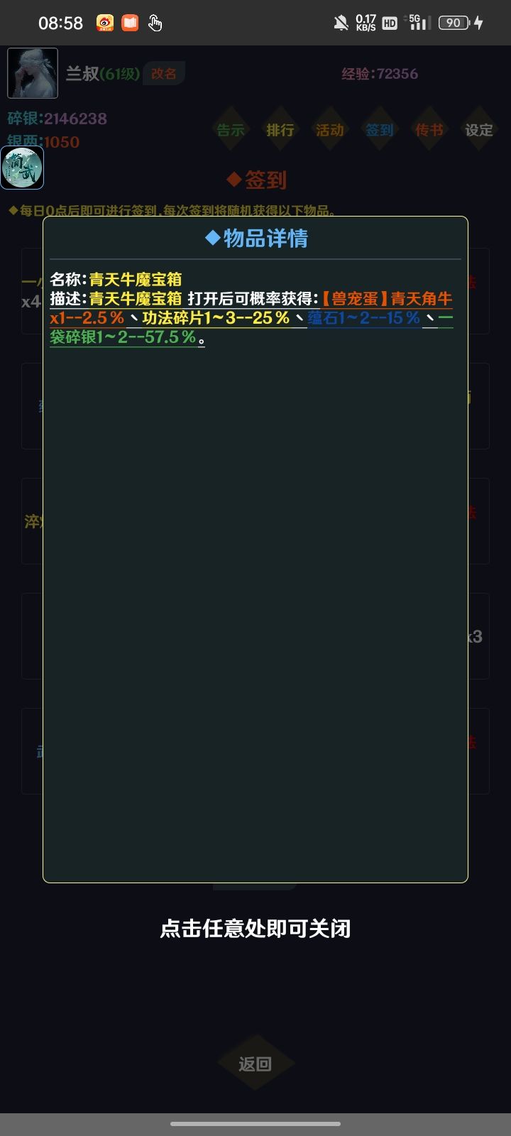 进游戏兑完兑换码,杀鸡就行,刷到无上•黑鸡,累积经验加成85。淬体不点加成少,点法器,同样概率法器给的加成多。锦衣买底下的,因为经验加成5,反正哪个高买哪个,买完再升锦衣。广告拉满,兑换双倍或者幻塔次数,幻塔给银两,一般我会点幻塔,双倍经验暂时用不上。银两我要么换头像,要么刷新遗迹,遗迹刷新不用心疼刷巨型遗迹兽宠,开青牛箱子会有概率得蛋,够用到100多级了,其它蛋留着开图鉴。天象花1碎
