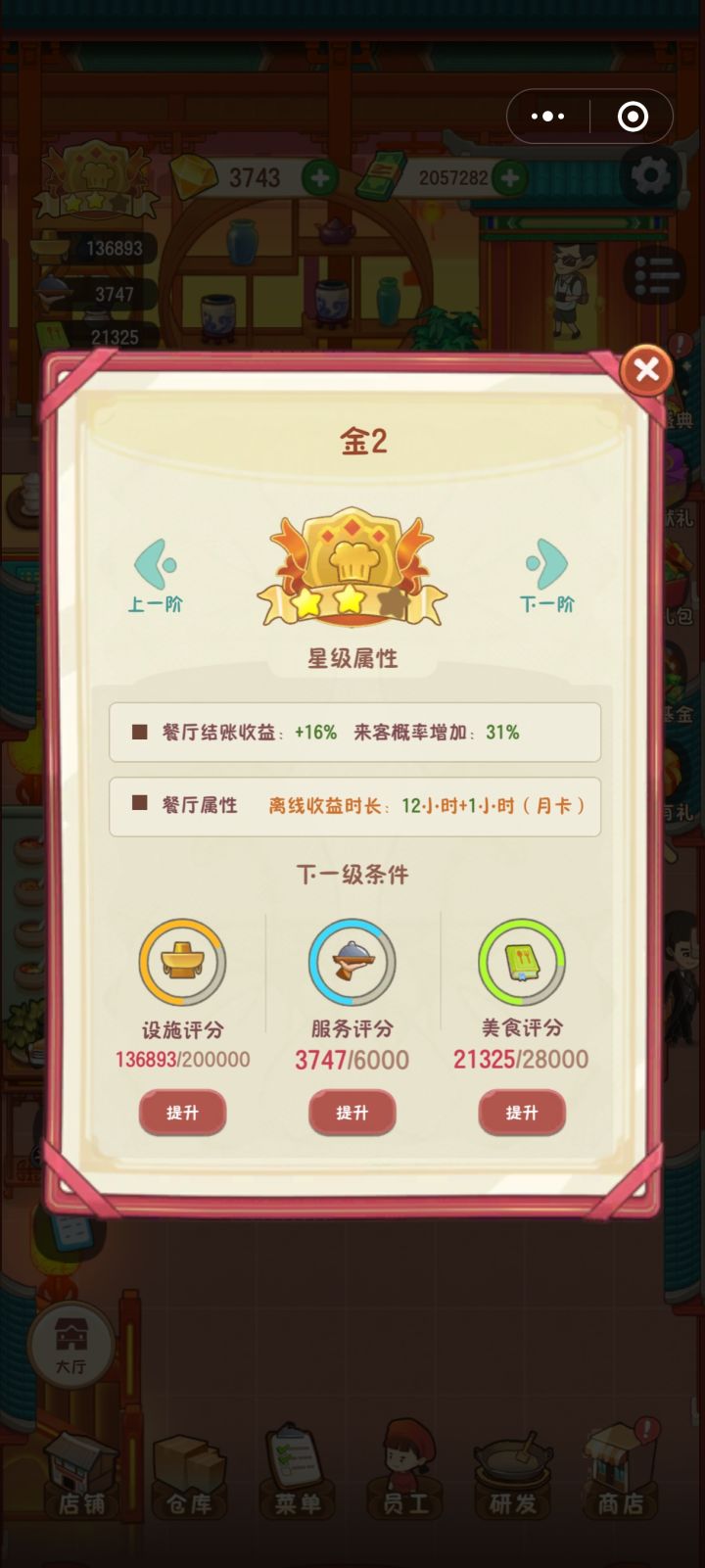 (大概就是1800,2700,5400,10800,包厢开启需要13888,配菜员16888左右吧?到后面包厢区的配饰什么的两万多,但是你一桌只能得四百,多的也才包厢的一千一单,所以佛系的人玩,不建议上头,不会弹广告,但是不看广告又上头的玩家会嘎巴一下死掉的)