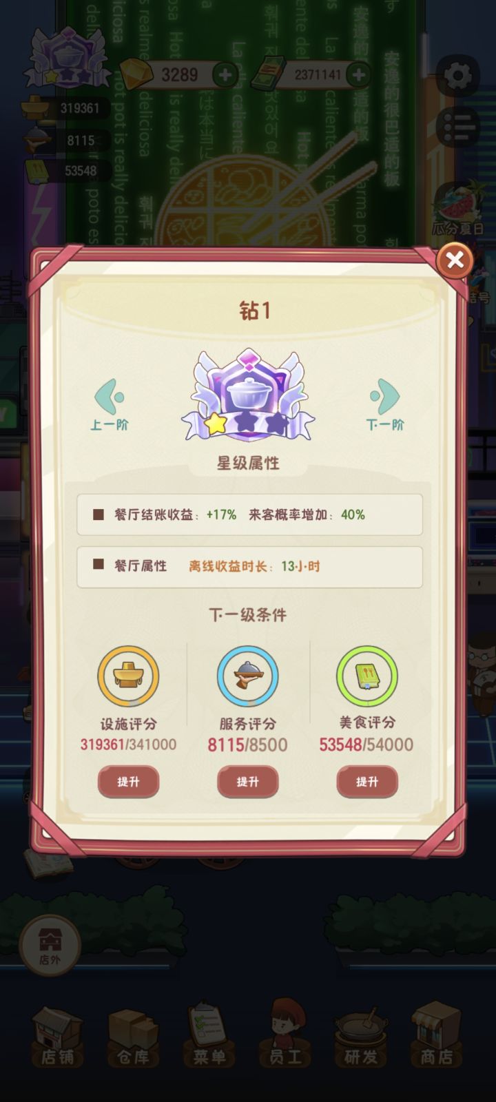 经营:营收会显示,成本,售价,利润,所以需要我们自己判断应该养什么菜品,我个人认为,结合销售量,以及升级后,售价提升了多少,来判断比较好(成本不变,很合理,毕竟食物味道变好了,涨价很合理吧?)