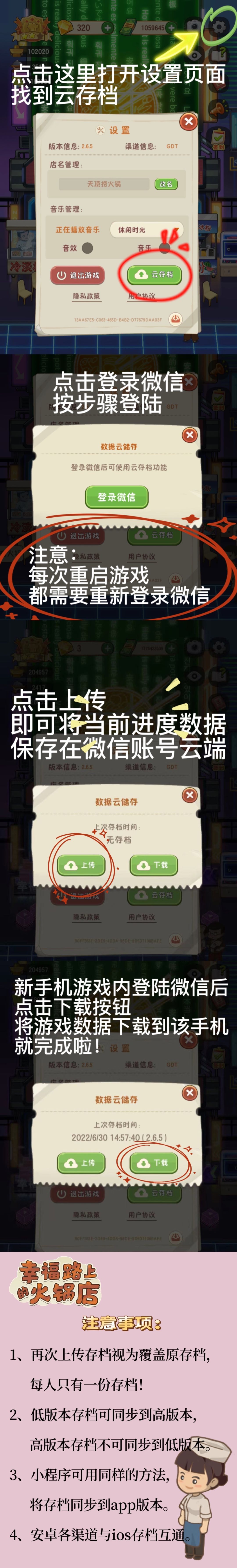 2.6.5版本更新内容 1.新增“云存档”功能(在设置界面中) 2.新增“霓虹”套装(1.2.3楼) 3.新增菜品锅底60 4.还原免费金币钻石领取位置到商店界面中 5.修复其他已知BUG 云存档已上线,感谢大家一直以来的支持 请大家仔细阅读存档方法和注意事项哦!!(*^▽^*)