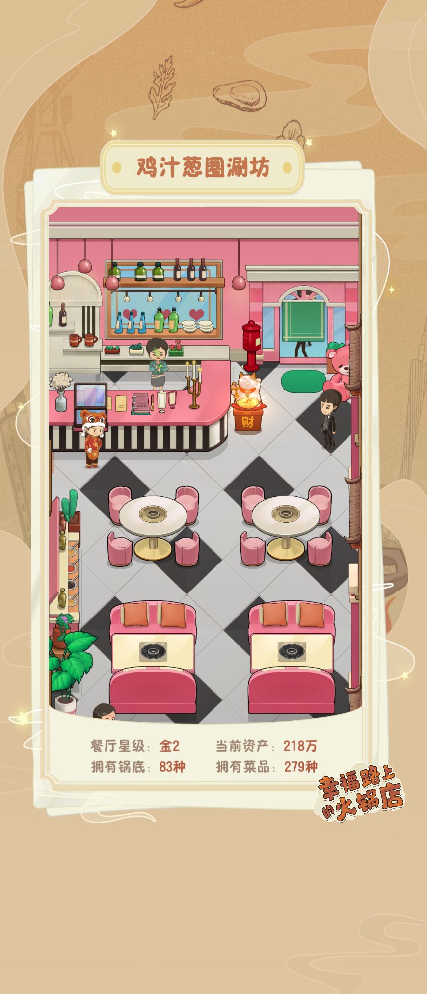优先升级一楼餐厅(初始的餐厅)装修差不多就行,不用着急买贵的因为那样前期绿钞会不够用,2,培养跑腿的就是服务员端菜的,尽量先可一个人先培育。3,尽量参与活动以及店外的娃娃机,可以快速获得员工手册等等,4,没事看看吧台旁边的招财猫,可以获得菜品材料。
