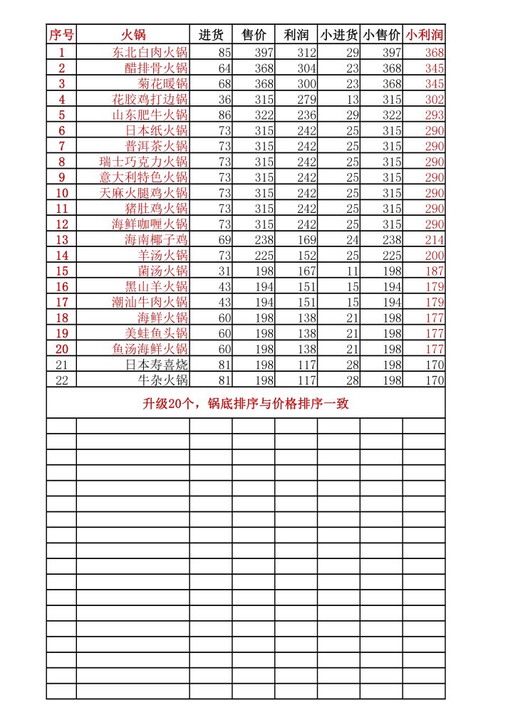 自助餐厅的解锁条件:金1,菜品40,蘸料20,锅底20。————————下图推荐升级金色锅底(共20个,小利润为金色菜品的利润,价格排序从高到低,2.6.2版本仅供参考)————————下图推荐升级金色菜品。饮品1个(饮品只升级1个35度飞天毛泰)。————————蘸料20个。小利润为金色菜品的利润,价格排序从高到低,2.6.2版本仅供参考)————————废话不多说,就看