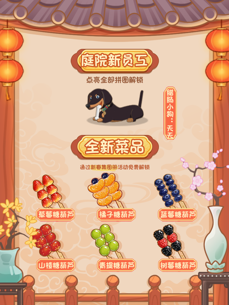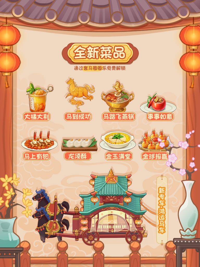 🧧骏马贺春🧧马年新春特别内容——🧧内容篇🧧锅子又来剧透啦!全新国风工作服🏮🧨戏曲工作服🧨——阿雯🧨戏曲工作服🧨——苏女士经典财神工作服🏮🧨财神工作服🧨——洪师傅🧨财神工作服🧨——岚师傅新春限定菜品、道具登场🏮🧨参与活动可免费解锁🧨庭院新员工登场🏮庭院员工:天天🧨点亮所有拼图可免费解锁🧨📲 参与方式:• 更新游戏版本至 5.4.0 以上• 版本预计在2月6日左右发布•