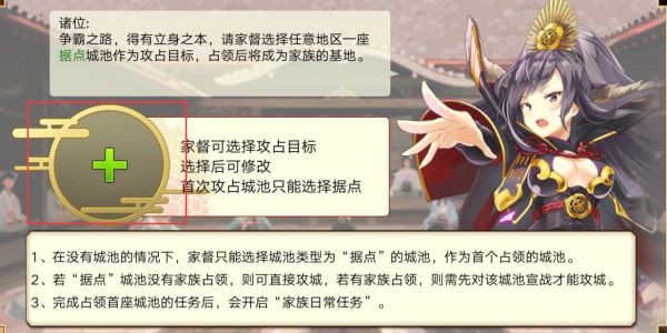 如果自己建家族怎么做?不想加别人的家族,想建一个家族自己当家督怎么发展。这里可以给些建议:1.建家族要花500判金,前期你不乱花存个几千判金是没问题的,当然,家族名字必须要响亮。家族建立后首先选一个城池据点作为开局的城池(很重要)。最好选地图两边的城作为开局点,防止被别人双面夹击,点击下面标注的按钮选择就行了。选好后派兵去攻打,把守城的部队杀完这城就是你的了。当然也可能会出现据点城池被别