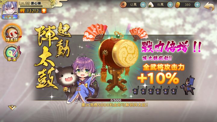 殿殿里可都是好东西,全部都是全战姬覆盖的成长点!战鼓、式神、家宝、装备,每个都能让你强力一大截,一个强不叫强,全战姬强才是制霸战国应有的亚子!一、战鼓春风吹战鼓擂,战国武姬怕过谁?!大军出征,怎能没有战鼓励军!战鼓可为全体战姬带来全方位的巨大提升,包括攻击、防御、血量、命中、闪避、暴击、韧性等。并且由于提升百分比数值,随着战姬的成长,所提供的数值将越来越强!(激活战鼓)(战鼓)二、式