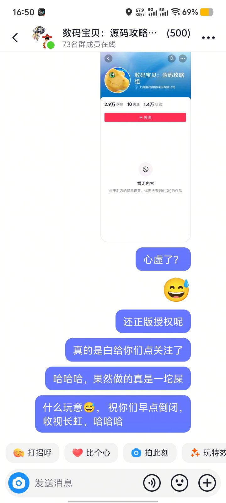 大家请避雷这个某知名厂商做的“数码宝贝源码”的换皮手游,前几天制作人直播,基本都是放的录像,玩家和制作人说话都不在一个频道,然后打着“正版授权的IP手游”幌子,做了个换皮正版游戏咱们先不说,然后看到玩家说盗版换皮,直接就把直播间给拉黑,微信公众号,还有微博如果有人喷游戏不好,怎么样怎么样也是直接删除评论,然而,这就是所谓的官方ip授权游戏,真的是白瞎了这个情怀IP点的关注,纯属国产盗版风的山寨游戏
