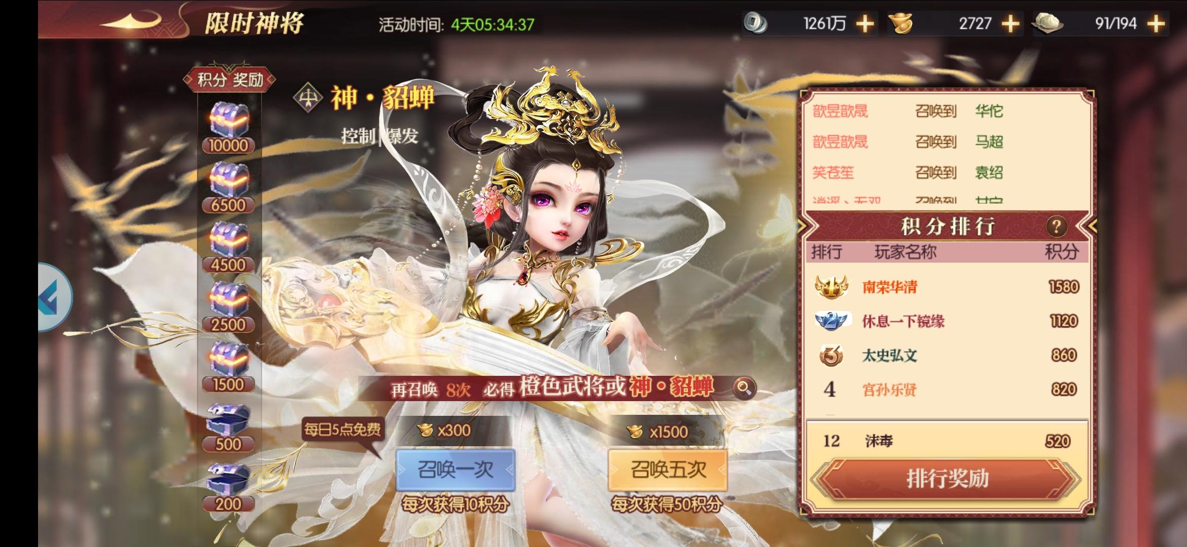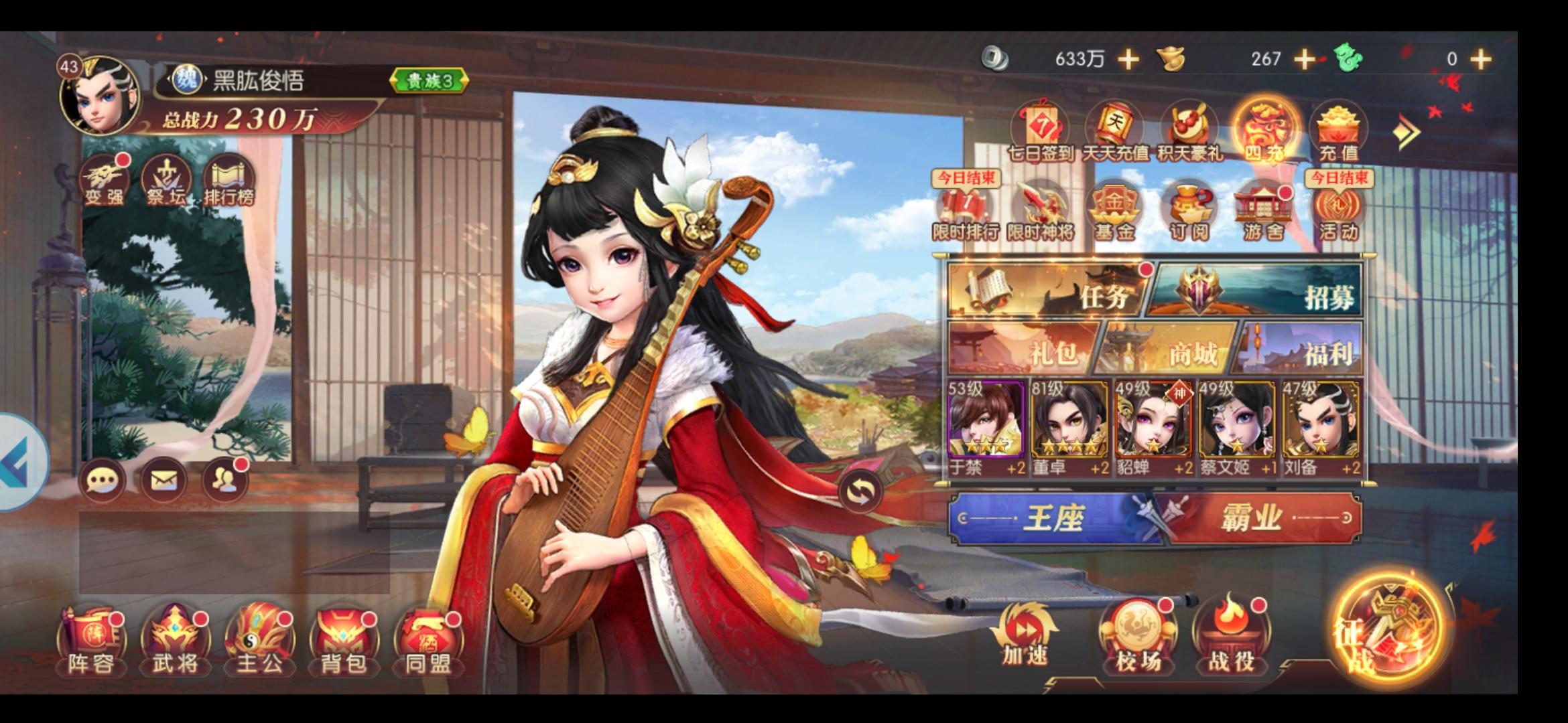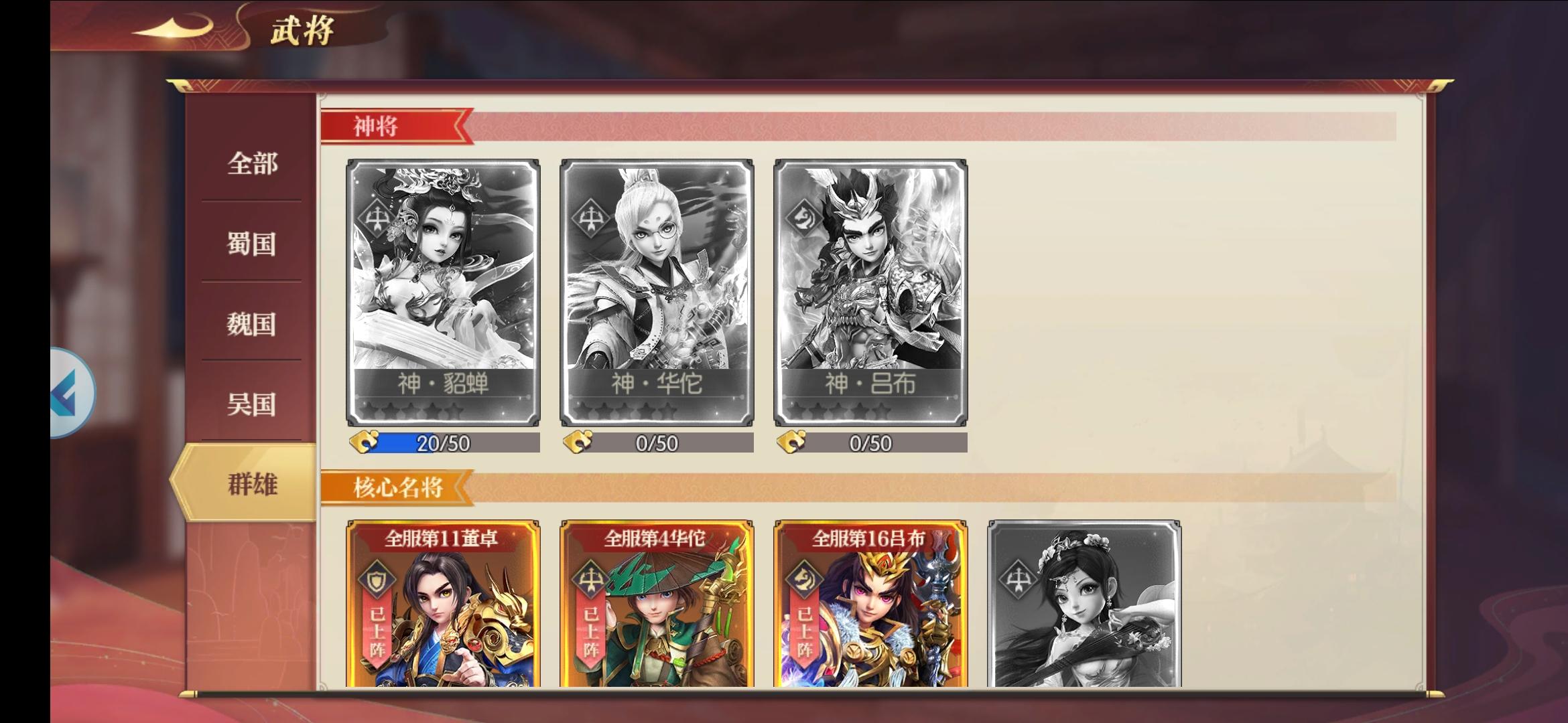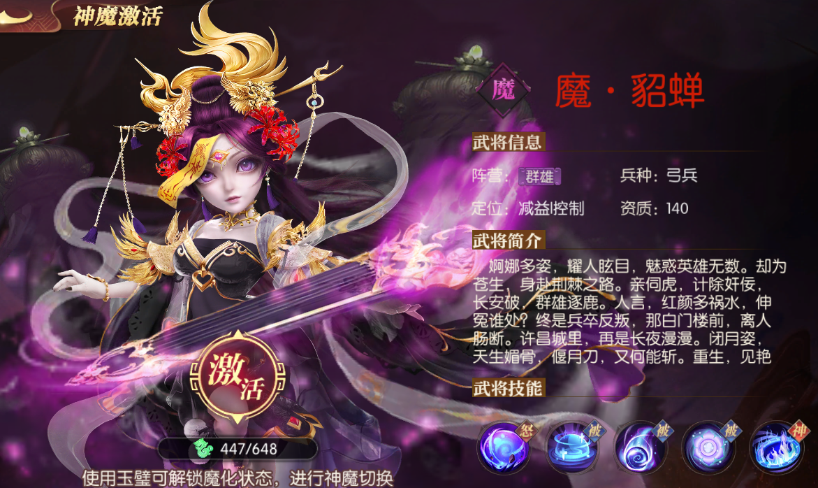 感觉控制强的的都在上面了,还有有几个不错滴都没抽不到,白嫖给了貂蝉我就充了100表示支持游戏,中期大致看了一下,这是充钱就能起飞的游戏,但是就是没法充钱了,一个648又不能只选,抽到神级的感觉没那运气, 要想真正起飞一个648也是远远不够滴, 全部人物有用的就那10多个,其他人物选错连起来只能被碾压,推荐几个特别强悍的,太史慈,孙策,大乔,周瑜,于禁,蔡文姬,李儒,诸葛亮,神级的没搞到不好乱说,还有些隐晦的机制就不说了