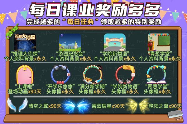 烂漫金秋,盛赞九月!课铃声伴随着孩子们的欢呼在校园里回荡,重返校园,预示着新学期就此开启!《推理学院》已为您准备好丰富的开学季福利,9月3日为您精彩呈现,快来围观! 活动时间:2021年9月3日14:00-9月12日23:59 活动一:迎新典礼 活动期间,每日登录游戏即可领取开学季奖励!玩家VIP等级越高,每日领取的奖励越好! 活动规则: 活动二:每日课业 活动期间,根据您累计完成“每日任务”的数