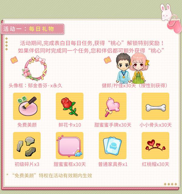在一年一度的520浪漫盛会中,您将与梦寐以求的缘分甜蜜邂逅!约上亲爱的TA,一起来参加这场美妙绝伦的限时活动,“自定义服装”设计资格正不限量发放中,快快参加吧! 活动时间:2023年5月11日14:00-5月21日23:59 活动一:每日礼物 活动期间,完成表白日每日任务,获得“桃心”,根据您累计积攒的“桃心”,解锁特别奖励!如果伴侣同时完成同一个任务,您和伴侣都可额外获得“桃心”。 活动