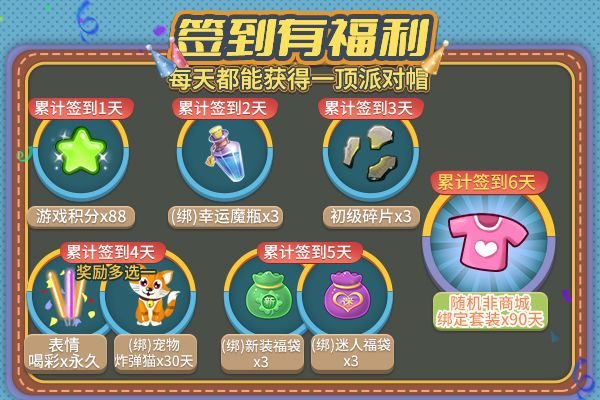 嘿,停下!让我看看你的名字,是否在秋季派对邀请之列——噢!失礼了,尊敬的派对明星,快请进!我们已为您准备好香甜可口的美食、缤纷夺目的鲜花以及新奇有趣的丰厚礼物!这场精彩的活动即将为您开启,无需任何热身即可加入其中! 活动时间:2021年10月15日14:00-10月20日23:59 活动一:签到福利 活动期间,700积分及以上的玩家每日签到时可额外获得粉、蓝、黄派对帽之一,有效期均为7天。 除此之