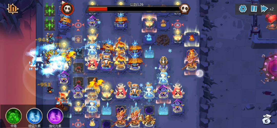 雪女调整一下位置,60以内围绕她来布阵,观察一下地图buff,构思阵型,设置集火点。雪女脚下是攻击力,往下走分别是暴击概率、攻击力、暴击概率。右下角清一色的攻击力格子。目前的想法是放弃暴击概率中间那个攻击力,陆军集火点就设置在被放弃的攻击力格子上。