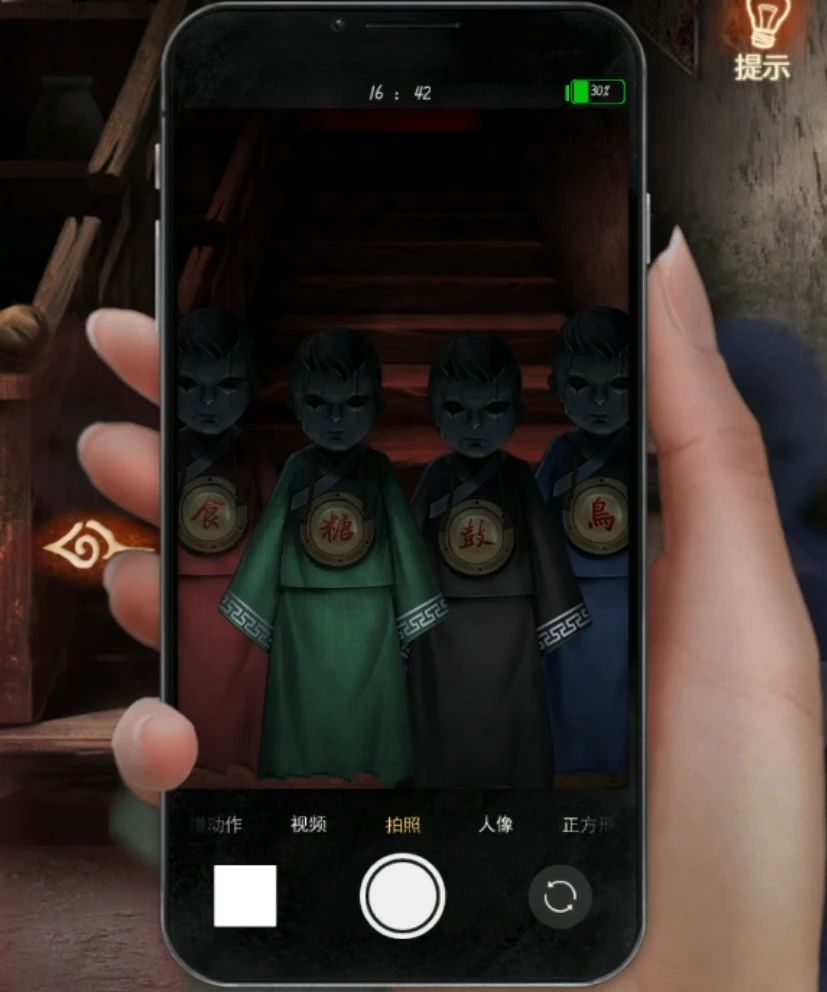 对了这个游戏唯一的优点就是不看广告了,进入第二章拿走桌上右上角的那盘菜,左边柜子打开拿到人偶身体和糖,旁边书上线索神要吃面食,吃饱了能接头,估计一会是要给人偶接头了。右边神像拿走木槌和包子,在左边的盘子放上桌上拿到的面条提示神像发生了变化,从神像嘴里拿到钥匙,就说面条是面食包子就不是了? 往右转会看到四个虚影熊孩子,掏出手机看一眼写着食糖鼓鸟,可以啊小小年纪就爱玩鸟!把包子给第一个拿到人偶,把糖给