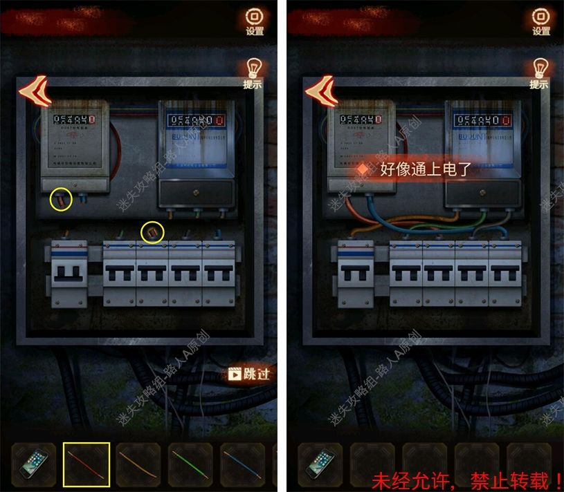第一章 1.跟着教程操作,得到5根【电线】和【手套】。 2.将5根【电线】连接到电箱里,打开电闸。(连接电线:先点击物品栏的电线,再点击电箱里相同颜色的接口两端。)2.1 3.前往厨房门前,拾取地上的【信封】,打开信封,得到照片。3.1 4.返回杂物间,根据照片的提示,调整3个布偶,得到【钥匙】。4.1 5.用【钥匙】打开柜子上的铁盒,获得【黄色布偶】。5.1 6.打开柜门,拾取【水桶】。6.1 7