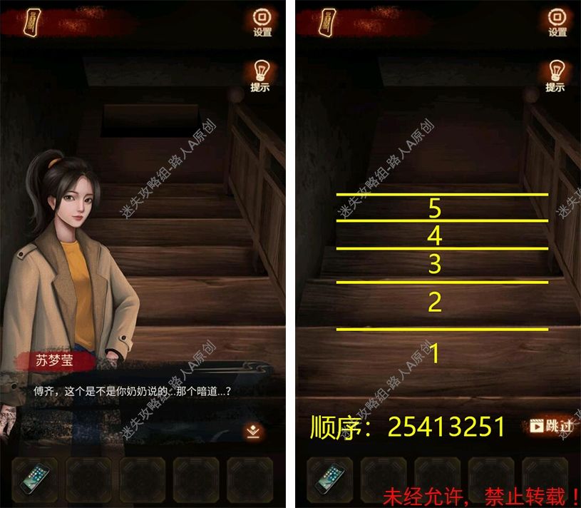 第四章:点睛 1.(楼梯)注意脚印👣亮的位置和顺序,按顺序点击木板(从上到下:25413251)。暗道的门打开 2.(暗道出口)点击查看墙上的日历📆 3.(暗道)点击墙上的机关,完成华容道小游戏 ,获得线索(金:甲子、银:丁丑、铜:申丙) 4.点击暗门,触发剧情。(有小高能)根据日历上的线索和对话线索(1998年11月、庚午日甲申时),推算出男主的生辰八字并输入:戊寅年癸亥月庚午日甲申时(4-1.