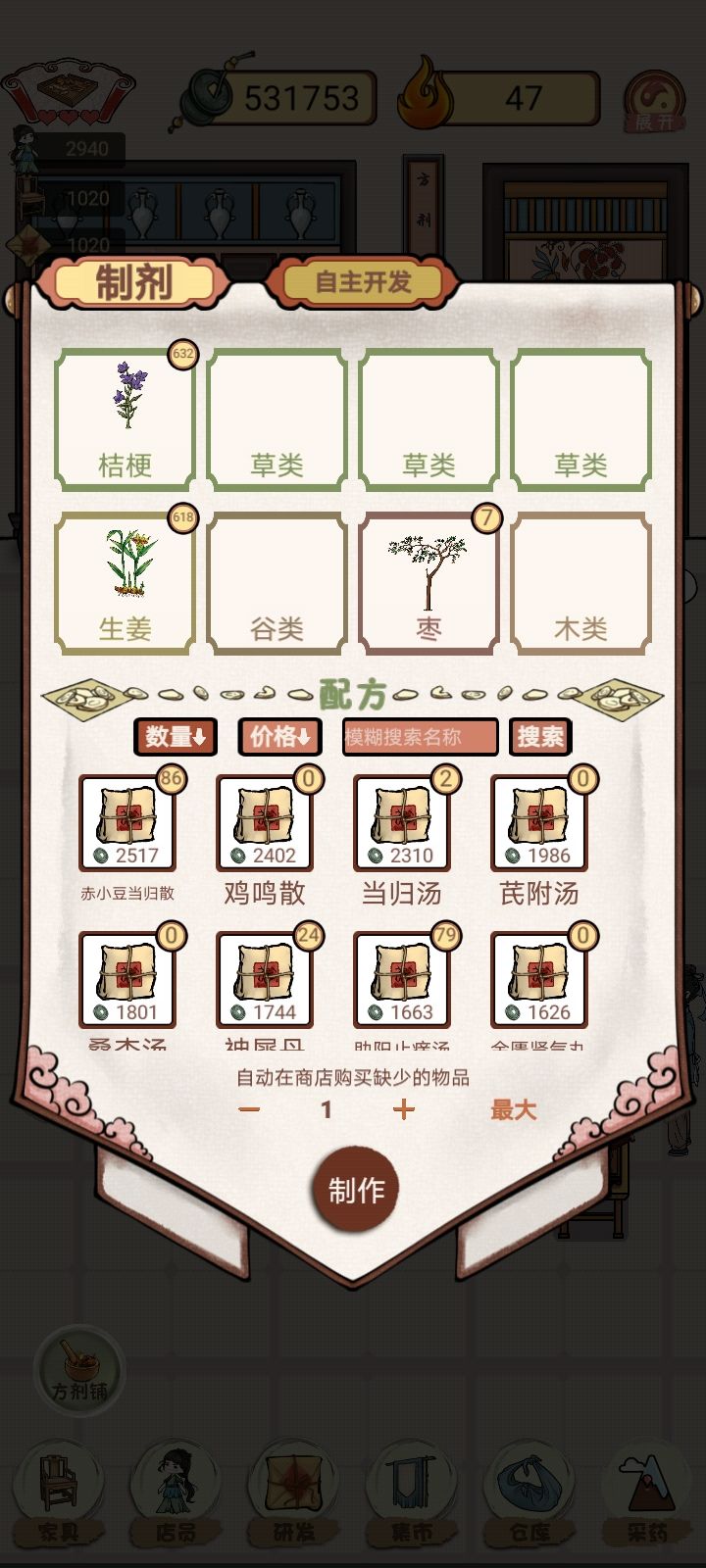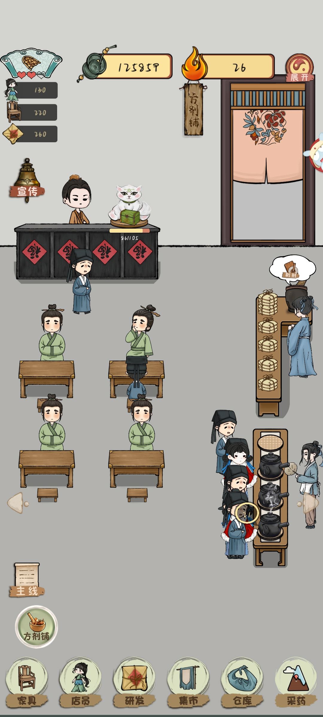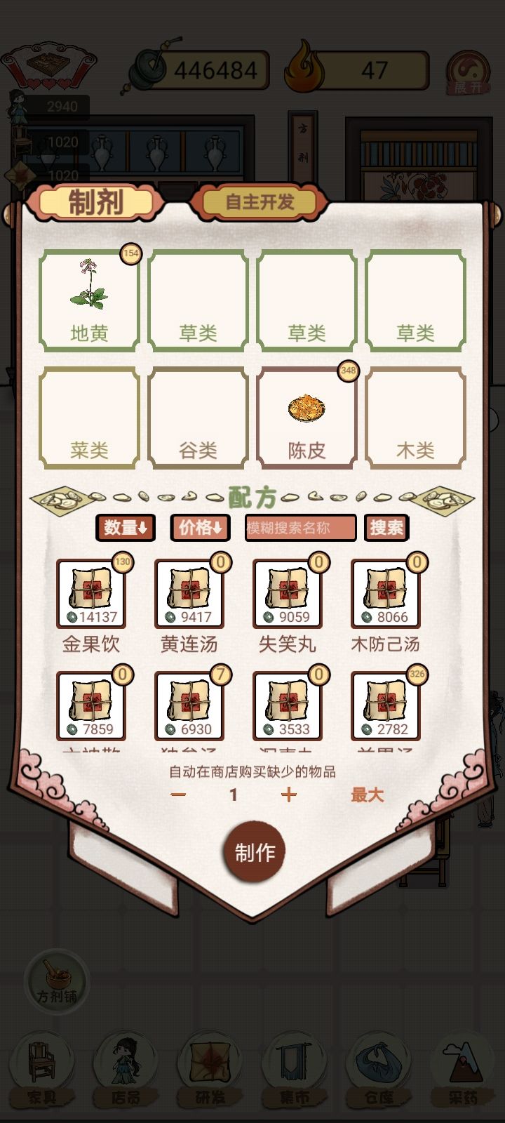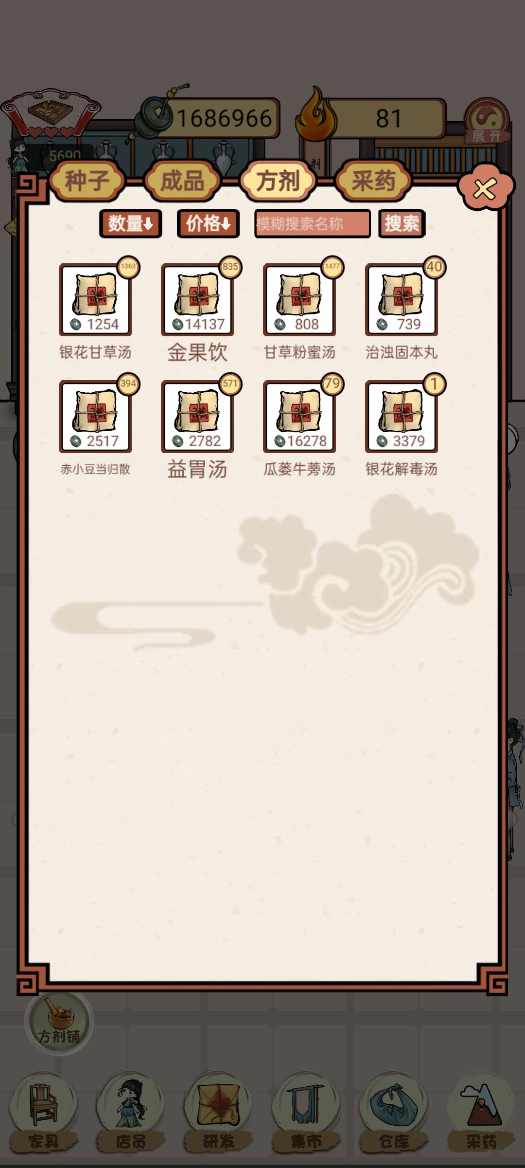 全部满级,现在就是有空就上线看个广,采个药,熬图鉴,计划一直玩到图鉴收集齐,方剂收集齐肯定是不指望了哈哈哈 我玩的很佛,前期用用加速,后期钱够一点买一点 前期就是解雇自动制作方剂,手动金果饮直接上。有钱就买地(草药地优先,其他前期够用就行),播种机一定要,经济搞上来,升级大夫和店员,其他的最后根据需要买买。 草药铺一定要最后开!不指他挣钱!早晚都能买满。