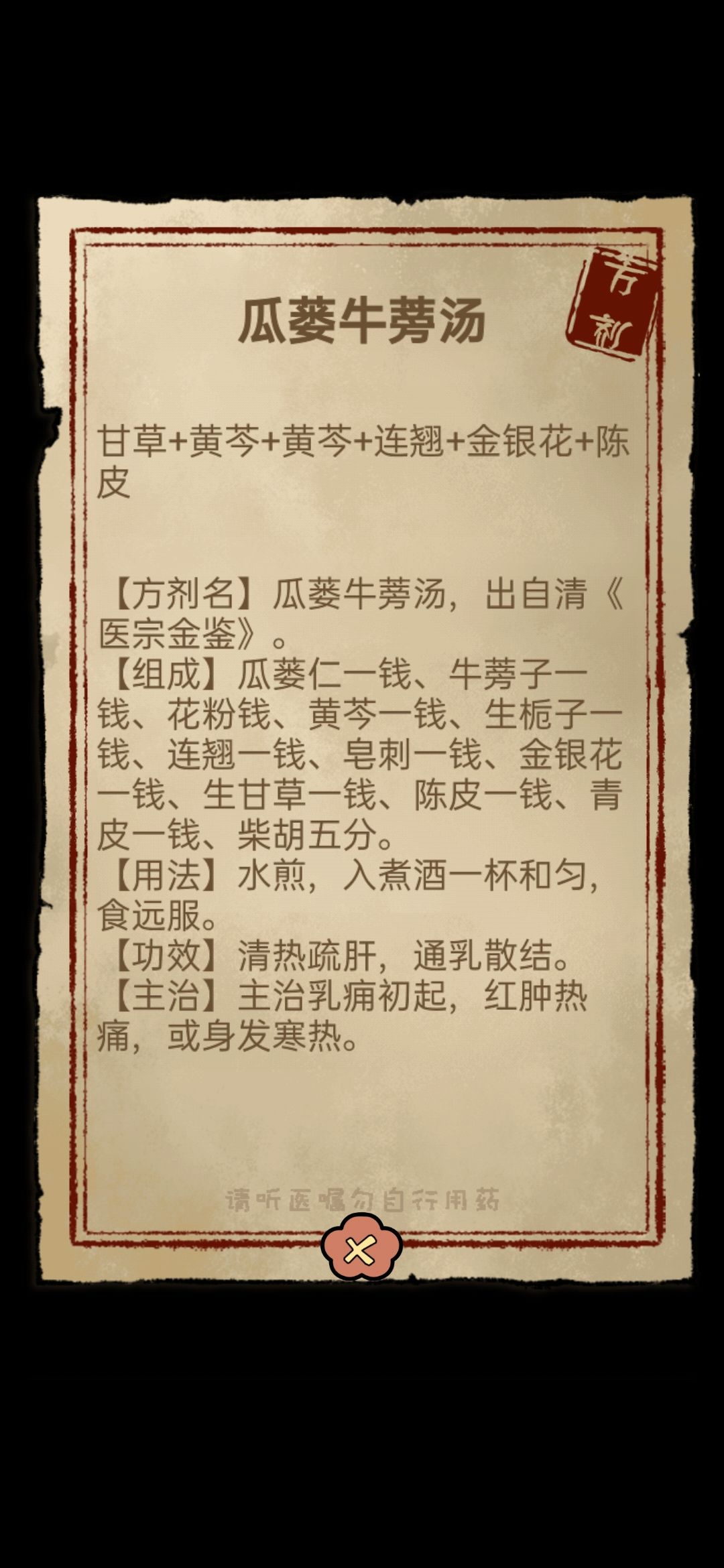 致富之路 给大家找了一个致富的药方😆 甘草有吧,金银花有吧,黄芩连翘能买到吧,陈皮找果子那一栏种橘子收获了就有大量陈皮。 就这样简简单单的药材来源,一份可以卖一万六,平均一波广告就能产生两百万的营业额,这不致富谁致富?😍 如果没有此药方 没有关系! 升级绵绵到满级,药材充足她会自己做出来