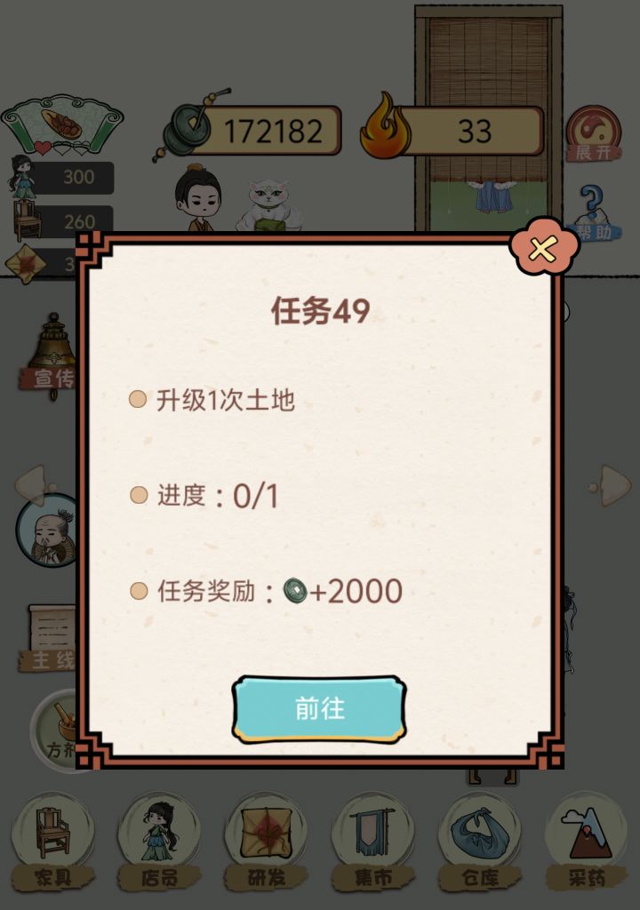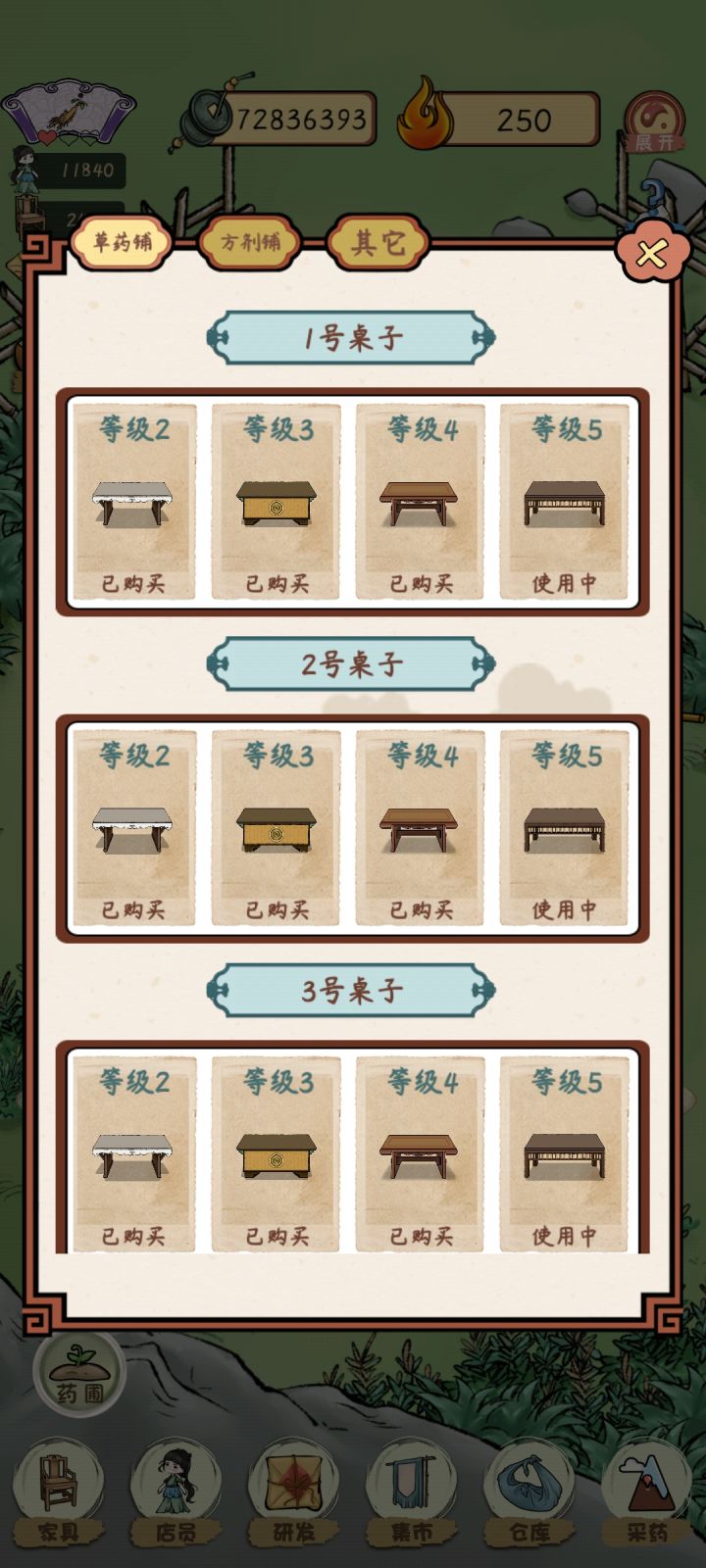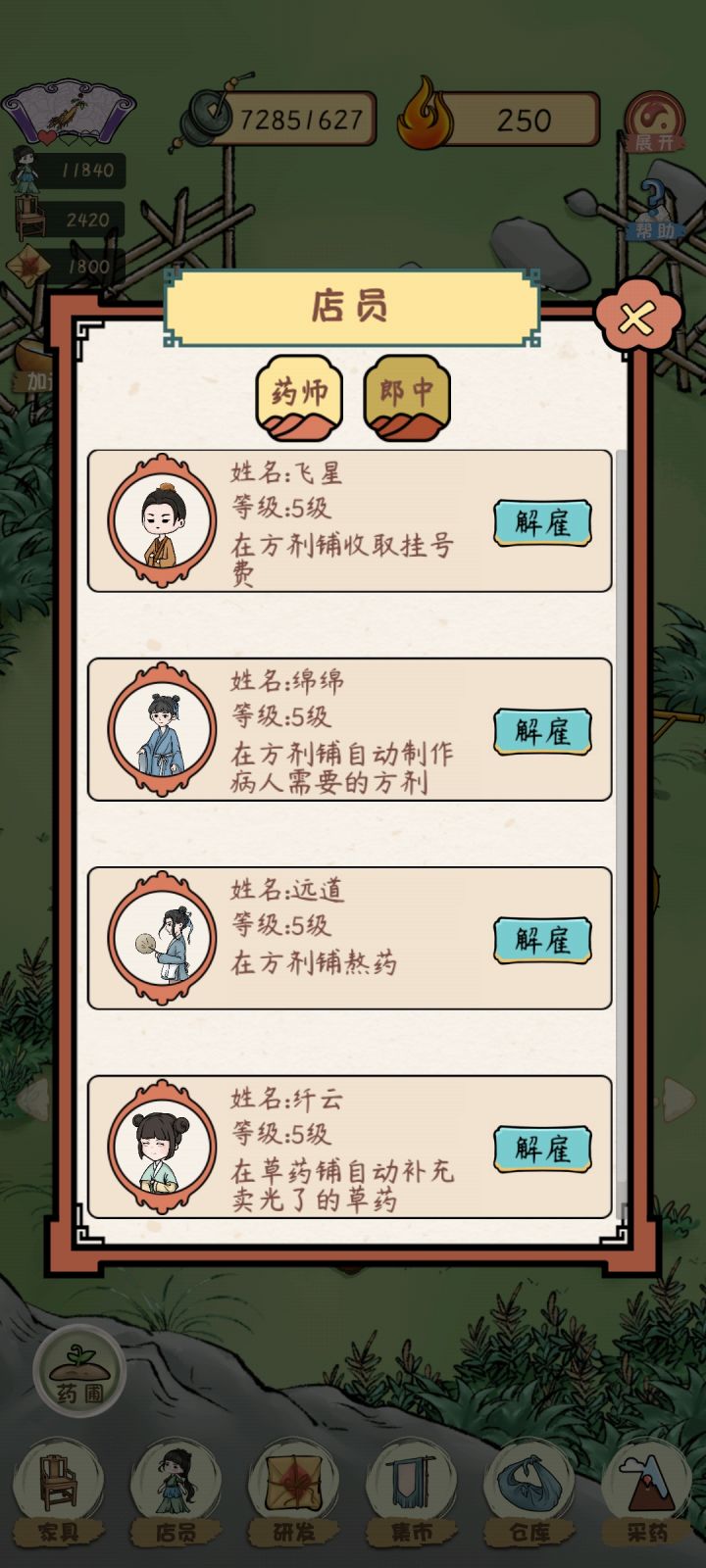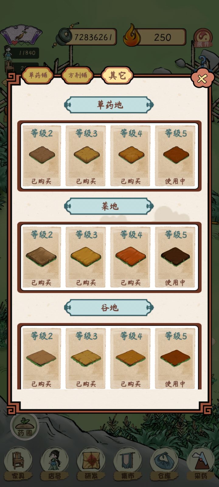 全部满级,现在就是有空就上线看个广,采个药,熬图鉴,计划一直玩到图鉴收集齐,方剂收集齐肯定是不指望了哈哈哈我玩的很佛,前期用用加速,后期钱够一点买一点前期就是解雇自动制作方剂,手动金果饮直接上。有钱就买地(草药地优先,其他前期够用就行),播种机一定要,经济搞上来,升级大夫和店员,其他的最后根据需要买买。草药铺一定要最后开!不指他挣钱!早晚都能买满。