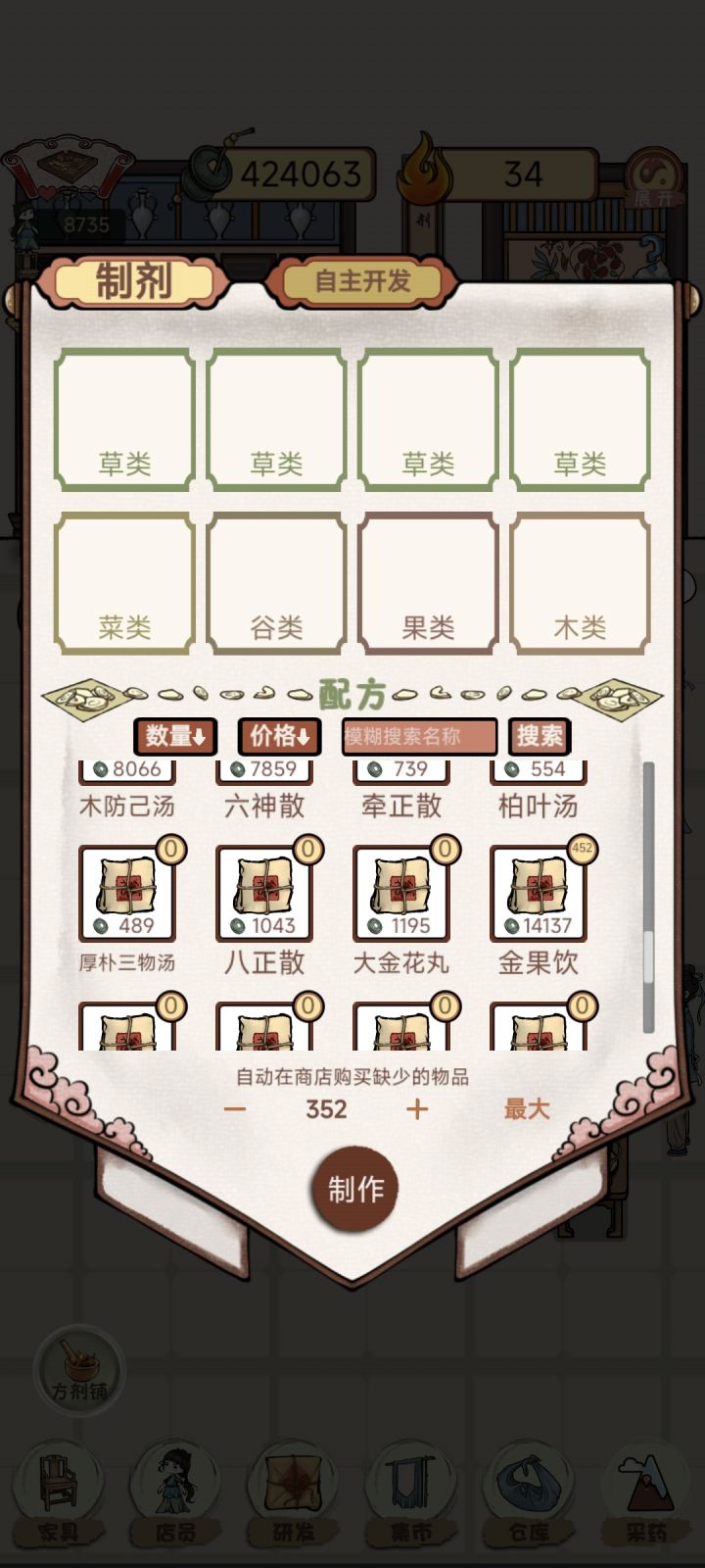 全部满级,现在就是有空就上线看个广,采个药,熬图鉴,计划一直玩到图鉴收集齐,方剂收集齐肯定是不指望了哈哈哈我玩的很佛,前期用用加速,后期钱够一点买一点前期就是解雇自动制作方剂,手动金果饮直接上。有钱就买地(草药地优先,其他前期够用就行),播种机一定要,经济搞上来,升级大夫和店员,其他的最后根据需要买买。草药铺一定要最后开!不指他挣钱!早晚都能买满。