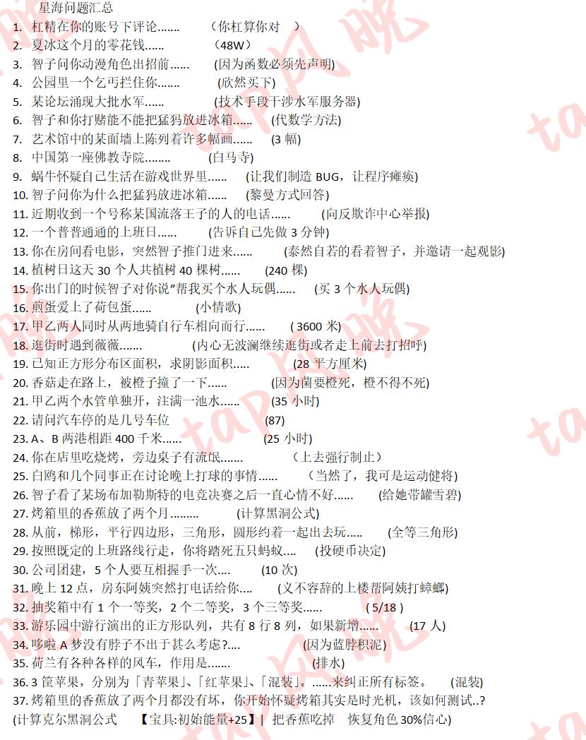 如题,需要选择的题目如下,有的事件怎么选都有负面效果,这里面的答案奖励,有以太的优先以太。 本来是没有水印的,但是有人偷我图,去B站发自制,唉,没办法,大家忍忍吧。 一图流和放大版的图如下。