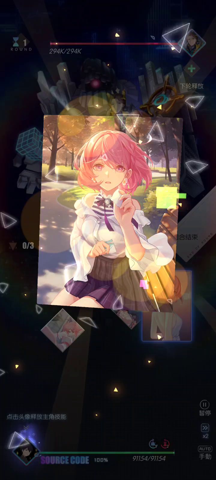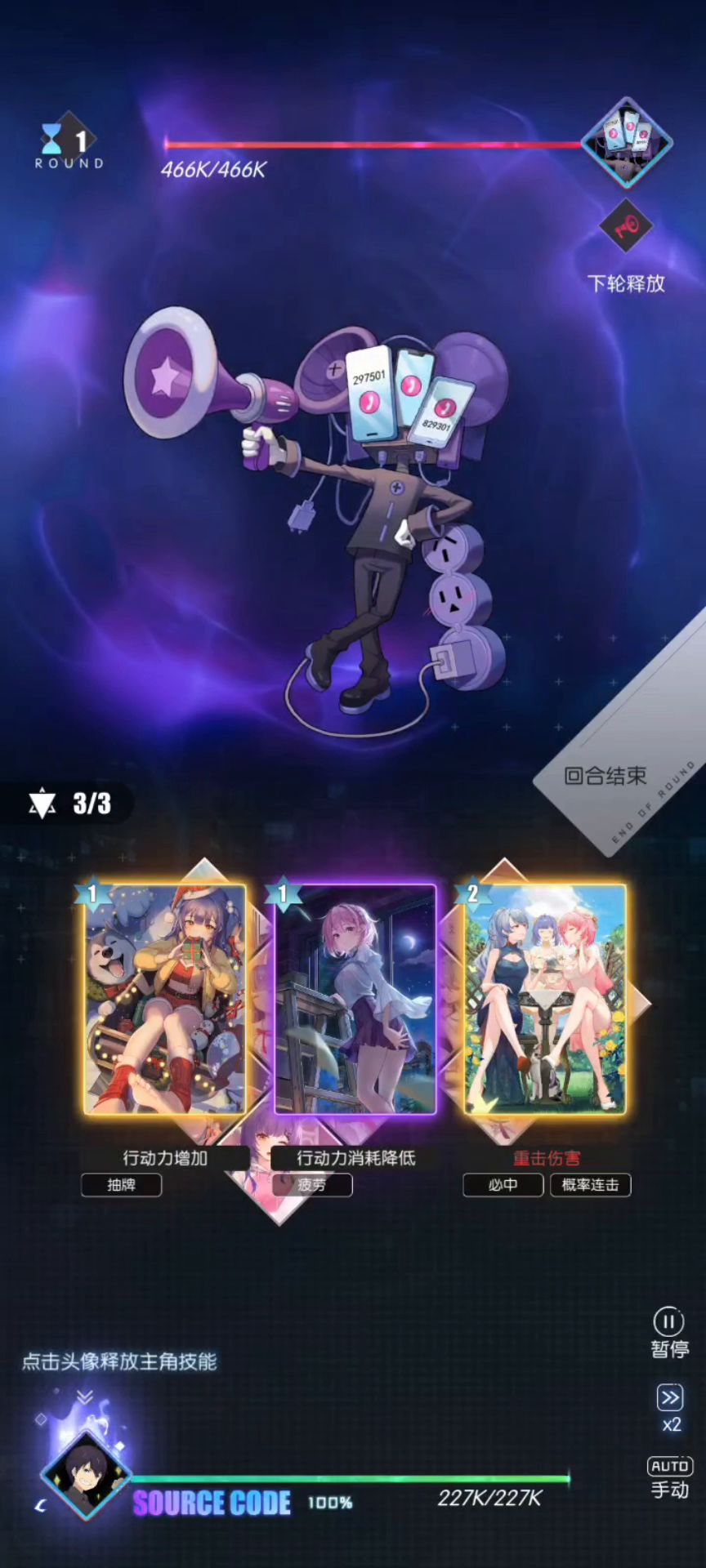 每轮加血一定要给上纠缠的减疗效果,然后用智子的黑客增伤加上121回眸的增伤效果秒他,最后10w血以下一定要周一去斩杀,可以凹一下牌序。