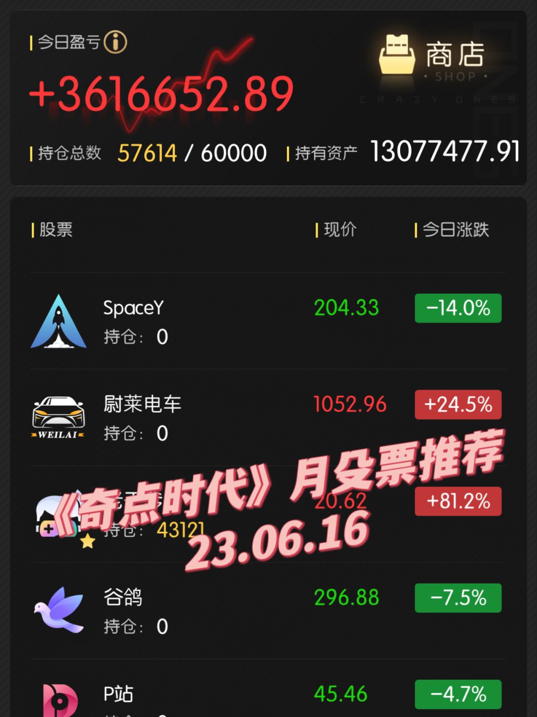 《奇点时代》月殳票推荐[2023.06.16] 12:00更新: 不好意思,有点感冒今天。一早没上游戏,根据我之前的攻略目前看来很明显直接all in SpaceY就好了 19:30 更新:SpaceY,谷鸽,米和油 (建议1 : 1.5 : 1.5) 后面有新动向再来更新… 写给审核大大:全文讲的是《奇点时代》手游里的一个玩法的攻略分享,玩法完全使用虚拟货币,无任何涉及到金钱的交易。