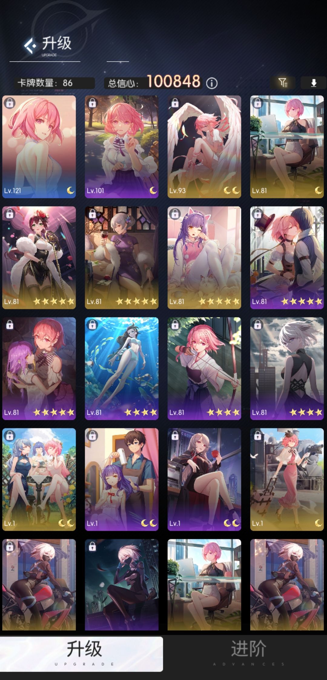 巨婴有两个技能,第一个是造成当前信心36%的伤害,不会致死,第二个是造成总信心23%的伤害,他的技能没有造成固定伤害的(比如5k,8k这样的),所以带的卡片总信心不需要太多,我只带了六张卡,方便能一直抽到想要的卡牌,三张百分比伤害卡,三张治疗卡,苏小野余晖碧影,其他雏鸦,白鸥回眸,白鸥疗愈之晖(神卡,有百分比回血有固定回血),随便两张回血卡,重置不额外消耗,所以尽情升级这几张卡就好了 上了6张,此