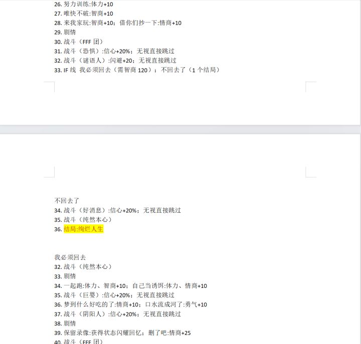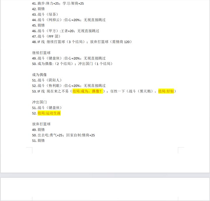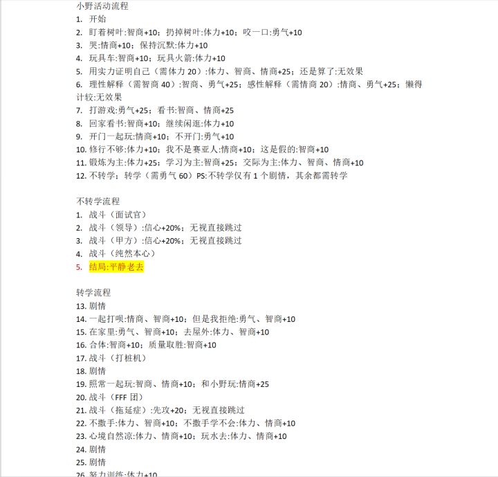 重点:要遇到小野需要60勇气选择转学 后面需要智力120才能回去找小野 放弃打篮球需要情商1201.盯着树叶(智力10)推荐 扔掉叶子(体力10) 咬一口(勇气10)2.保持沉默(体力10)推荐 哭(情商10)3.玩具车(智商10)推荐 玩火箭(体力10)4.实力证明自己需要体力20(体力智力情商都25)5.理性解释需智力40(智商25 勇气25)6.看书(智力25 情商2
