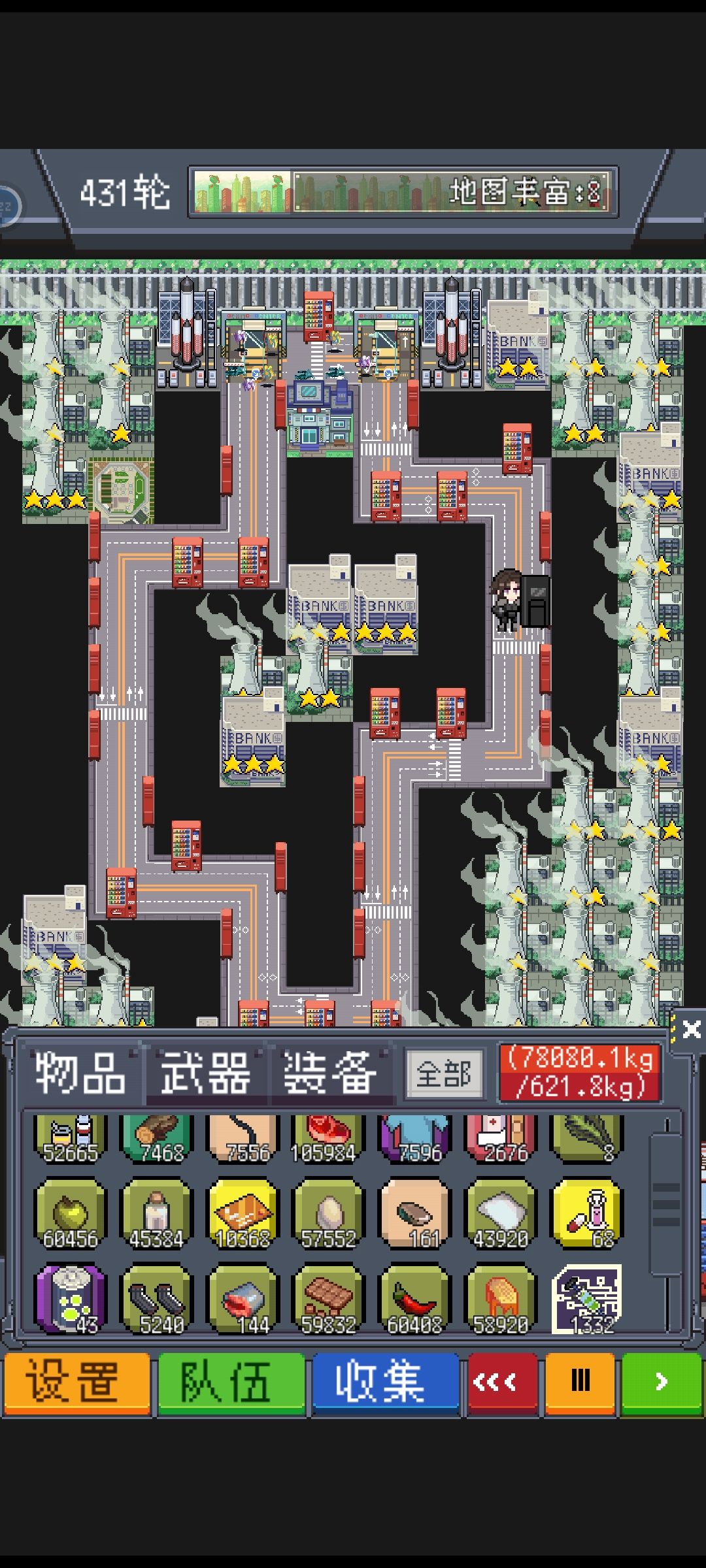 警局流是刷弹夹,一般武器必备,还可以顺带刷补给,但新出的零元购,让你摆脱了杂货店流的低速度低效率,收获看第二张图,零元购总共分高配版和低配版,但核心技术不变,就是卡牌,现在卡牌的攻略太多了,具体就不介绍了,大概操作方法就是将城市的牌,卡到村子,避免火车的出现,杜绝刷怪,实现挂机,第一张图是低配版,就需要卡一个售货机,主要是收益较高配版少了很多,第二张图是高配版,需要卡五张牌,售货机,工厂,发电厂,拆除,大厦,建议卡牌的时候每张留两张再开始卡,避免出现失误,高配版收益极高,刷各种食物和钱,钱现在还可以升级武器,效益极高