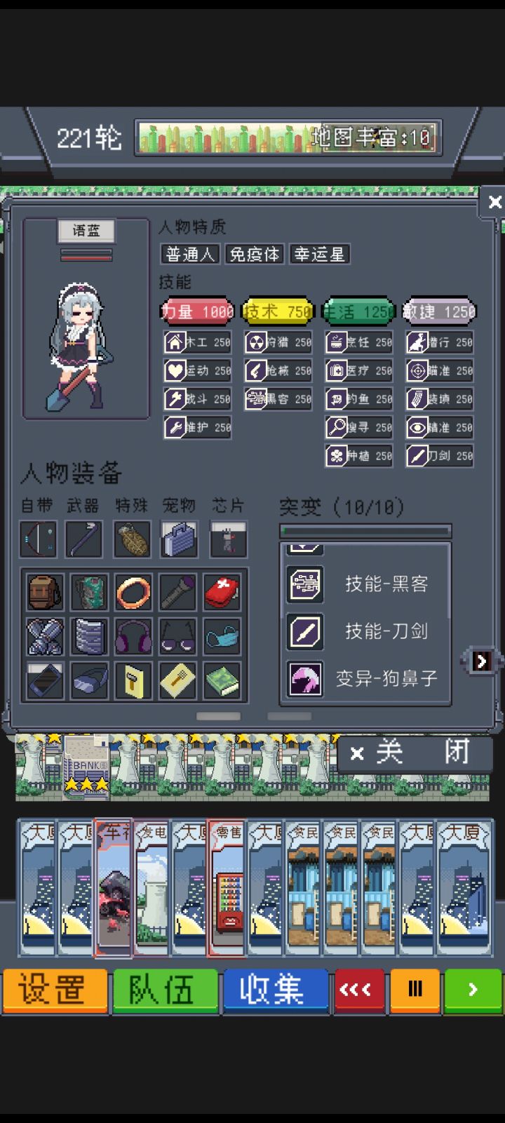 语蓝在我看来是最特殊的角色一是不会感染二是幸运星一般来说,角色变异选择是技能无限优先,二语蓝不同,技术对语蓝的增益极其有限首先放上我选择的变异瞄准精准装填刀剑战斗这几个是技能类的,增益并且极大,基本必选完美暴击金属化空气子弹这三是打伤害必备的,完美暴击是因为语蓝额外的暴击率,金属化后期必备,空气子弹只有弓需要。狗鼻子预测这两个有人带就行,可替换,综合考虑我选择语蓝