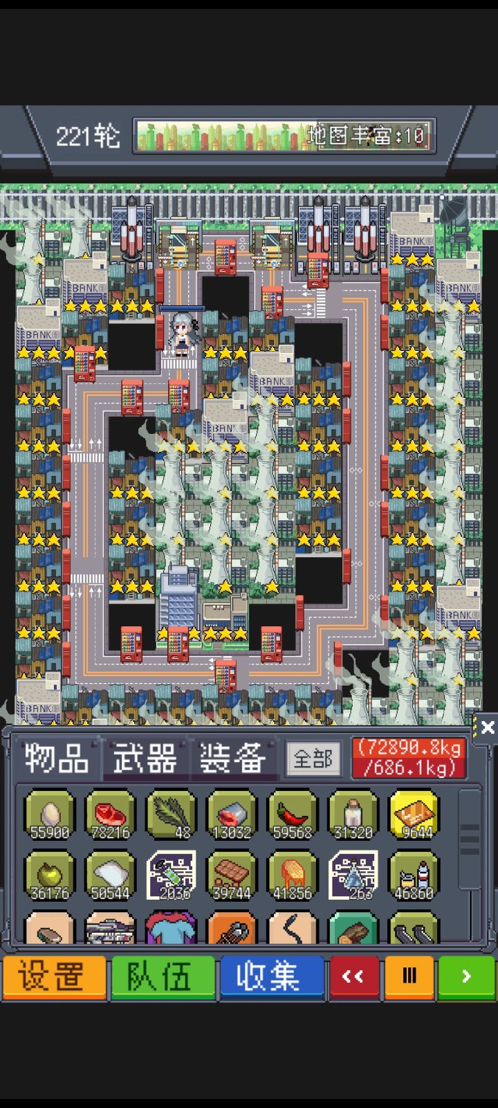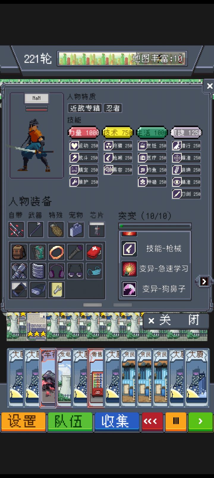 主要是为了刷食材回去做菜,刷其他资源顺手的事。必开无敌+四倍,别为难自己。全员撬棍+狗鼻子,这两效果都是叠加的。预测不叠加,给其中一个人带就行,推荐给安娜,她空位多。我这些人物都是全技能突变+致死+狗鼻子,有多的空位可以上极速学习,旋风斩,子弹拐弯之类的。进图带五张卡工厂(+发电站+大夏合成银行,不刷钱不带也行,顺手的事)车祸(前期布局阶段大量刷怪过卡,后期全拆换售货机)警局(放铁