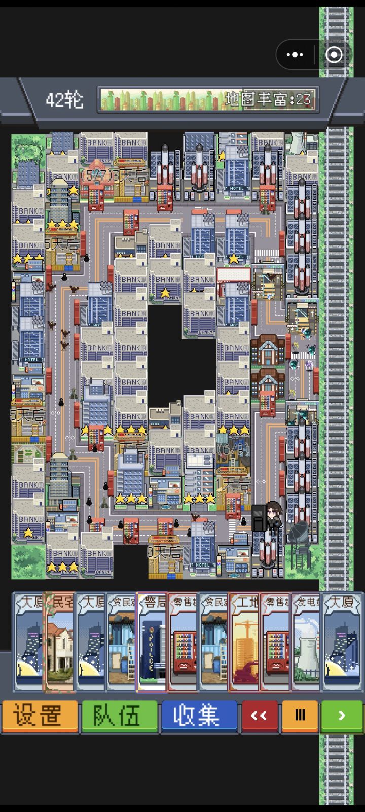 52回合基本成品,右上第一个收费站拿来刷商场升别的,右下留一格放贫民窟喂回收站