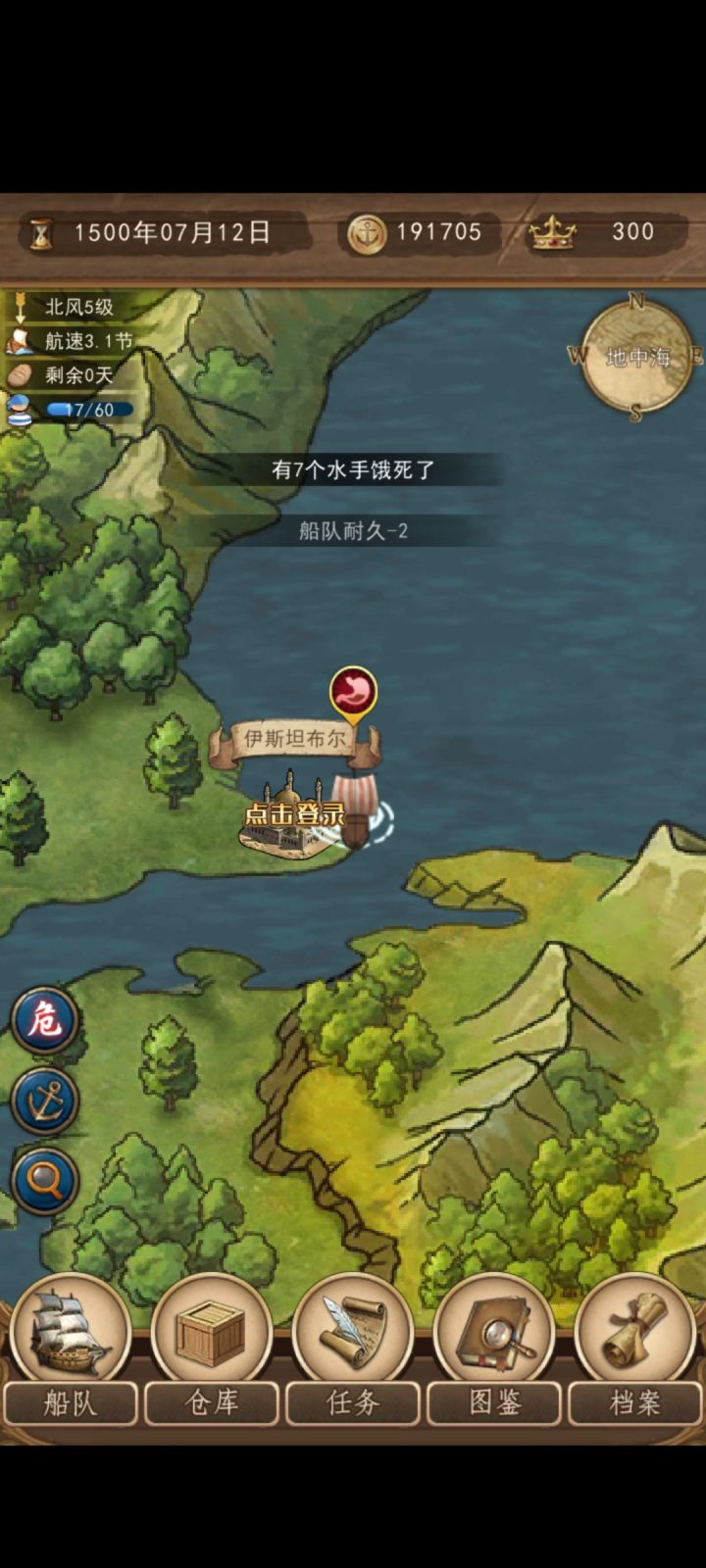 居然在这里卡死了。。。14天,活生生风力4力,船3动力,原地走不动。死了。。。