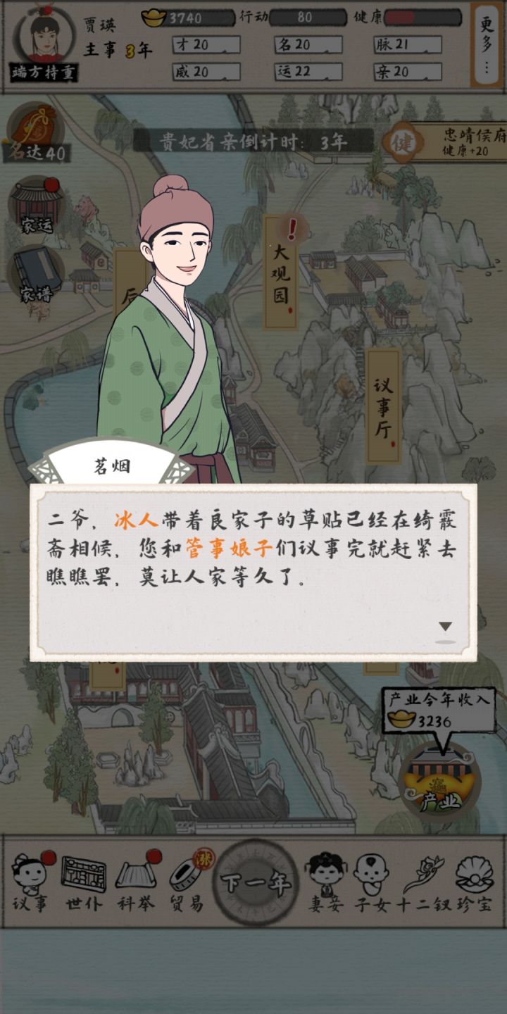 2、只要安排在合适的位置,所有的世仆都能产出高于自己月钱的收益,所以前期不要吝啬资材来雇佣世仆,经营产业。