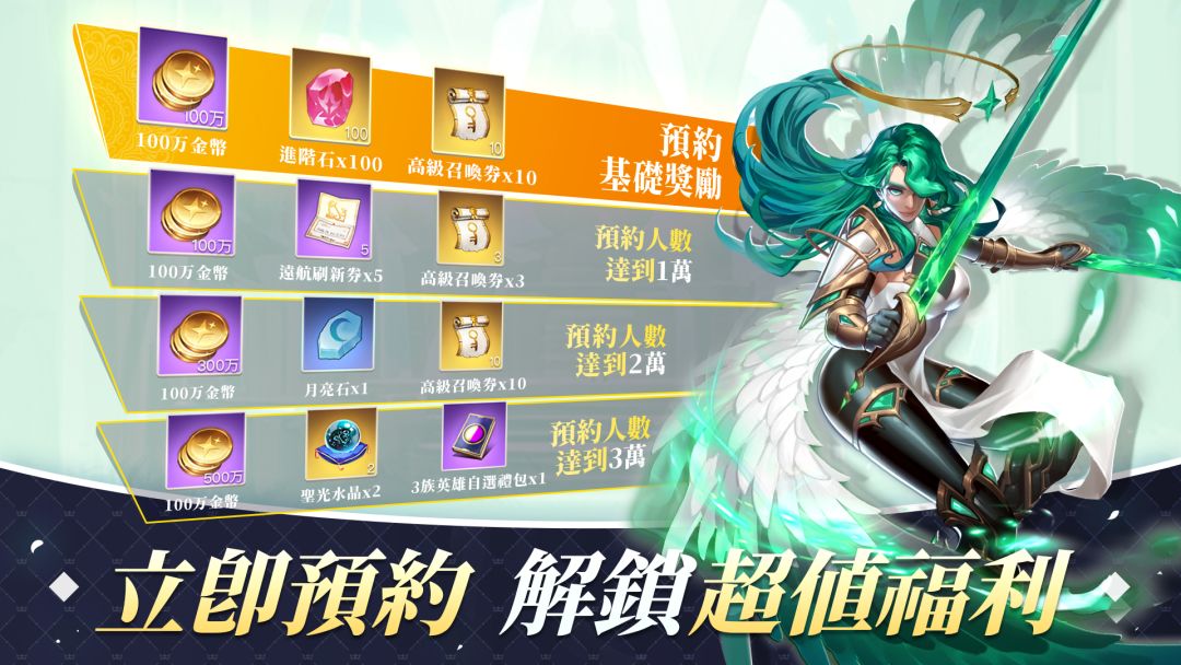 隐私政策 开发者的话Hi,這位英雄,久等了 天使之心正式開啟預約啦~ 立即預約解鎖超值福利! 預約基礎獎勵:100萬金幣+進階石*100+高級召喚劵*10 預約人數達到1萬:100萬金幣+遠航重繪劵5+高級召喚劵*3 預約人數達到2萬:300萬金幣+月亮石*1+高級召喚劵*10 預約人數達到3萬:500萬金幣+進階石*100+3族英雄自選禮包*1