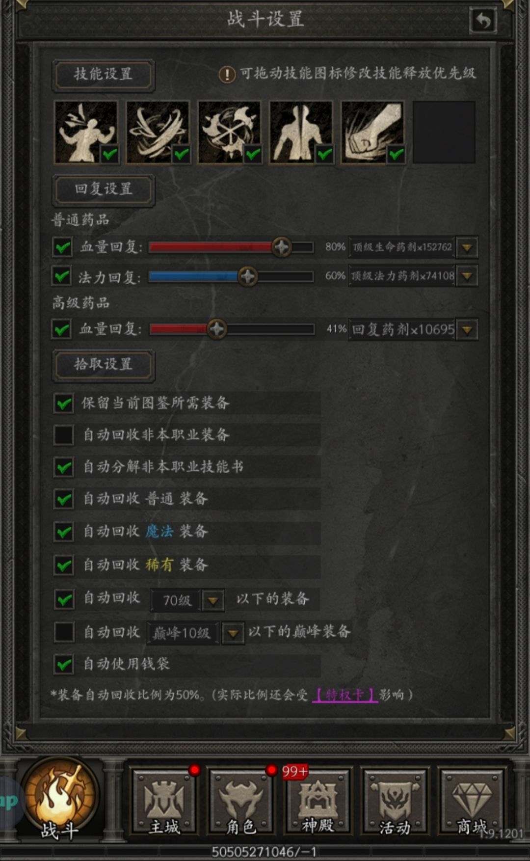 由于本次更新改动了一些前期的内容,我们经玩家同意,将改动内容以攻略形式公布。 感谢的攻略授权!! 原贴链接: 以下是攻略内容: 正文 1、进入游戏,20级之前,都按照任务要求做任务,需要注意的是先点血条左边的那个小药瓶图标(这个是挂机设置)设置回收规则 2、点设置图标,兑换码使用兑换码【长期礼包码】vip12345、vip8888、vip9999、ios666、ios888、ios999,以及去t