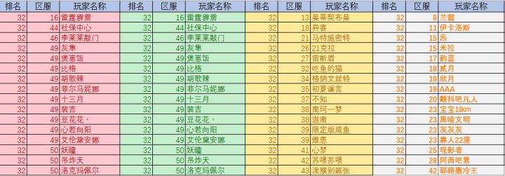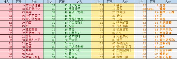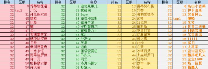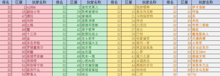 各位亲爱的玩家老爷们大家好呀!又到了竞技场快报时间啦~今天的主要内容是上周全民竞技场的排名状况~各颜色代表等级区间首先是32强:16强:8强:4强:亚军:冠军:以上玩家可获得奖励:冠军:Xll*1、高级献祭石x5、重塑石x50、钻石x800亚军:XI*2、高级献祭石x3、重塑石x40、钻石x640第3~4名:XI*1高级献祭石x1、重塑石x32、钻石x520第5~8名: