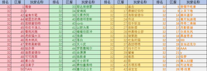 各位亲爱的玩家老爷们大家好呀!又到了卡子快报时间啦~今天的主要内容是上周全民竞技场的排名状况~ 各颜色代表等级区间首先是32强:16强:8强:4强:亚军:冠军:以上玩家可获得奖励:冠军:Xll*1、高级献祭石x5、重塑石x50、钻石x800亚军:XI*2、高级献祭石x3、重塑石x40、钻石x640第3~4名:XI*1高级献祭石x1、重塑石x32、钻石x520第5~8名: